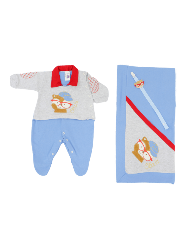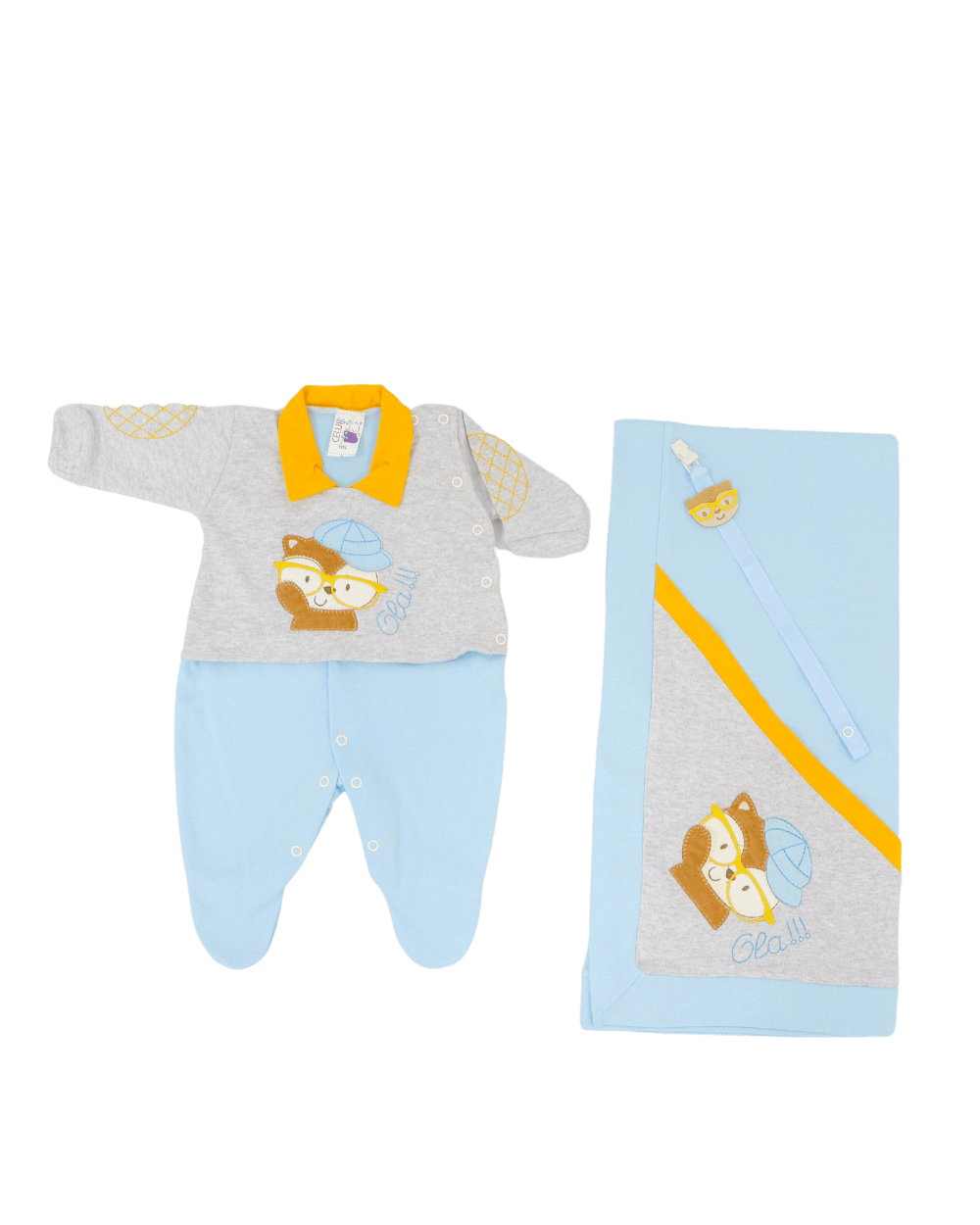 Saída de maternidade suedine menino, macacão manga longa peito bordado. Acompanha manta e um prendedor de chupeta.