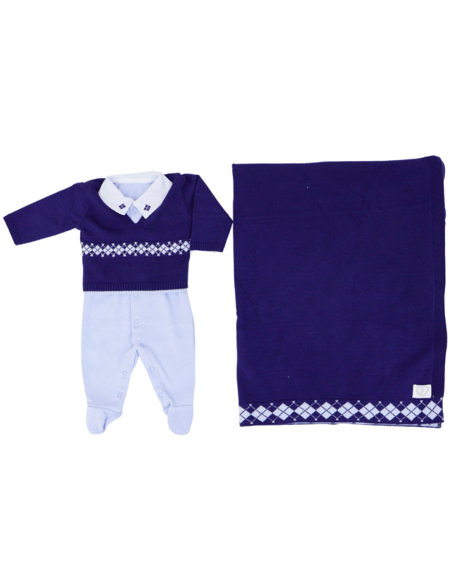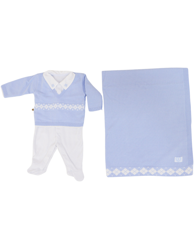 Saída de maternidade Fofifnho, menino, contém 1 casaco, 1Macacão e 1 Manta. Medidas da manta: 78 x 78cm Composição: Casaco: 64% Viscose 23% Poliéster 13% Poliamida . Macacão: 100% Algodão. Manta: 64% Viscose 23% Poliéster 13% Poliamida.