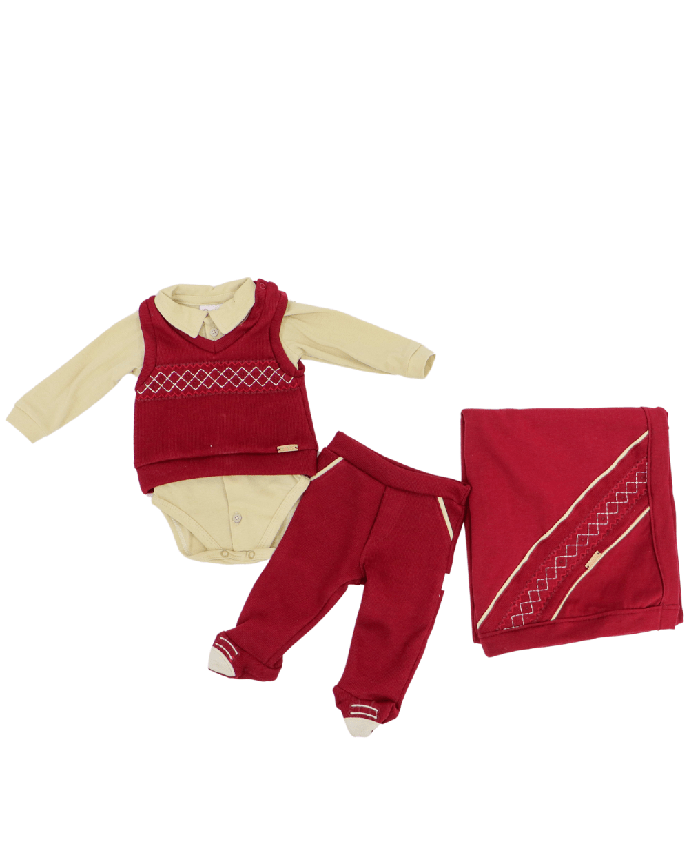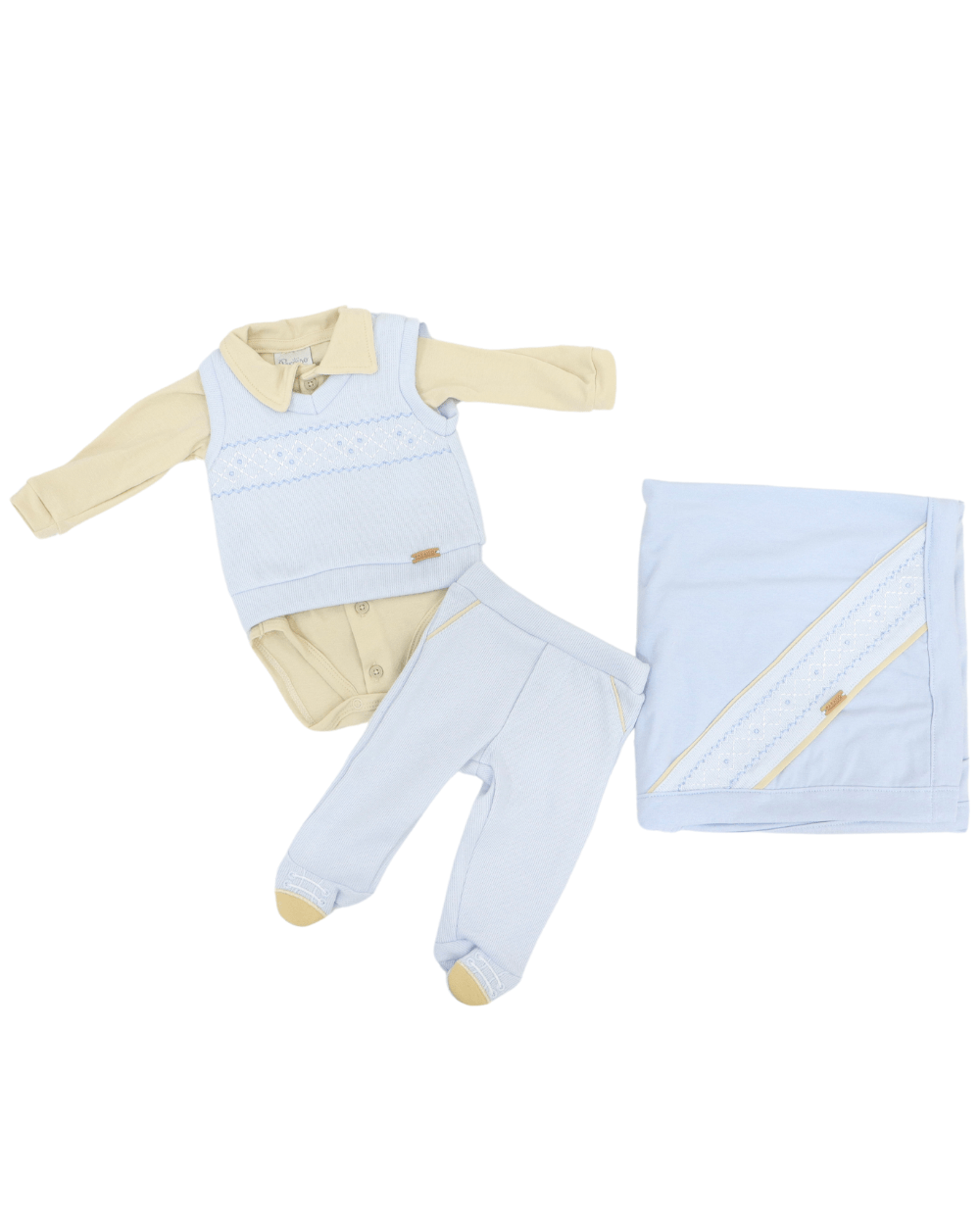Saída de maternidade Paraíso, menino, macacão manga longa peito bordado. Acompanha manta, colete, calça e body. Medidas da manta: 70cm x 80cm Composição: Body: 96% Algodão 04%. Elastano Manta: 96% Algodão 04%. Calça e Colete: 100% Algodão