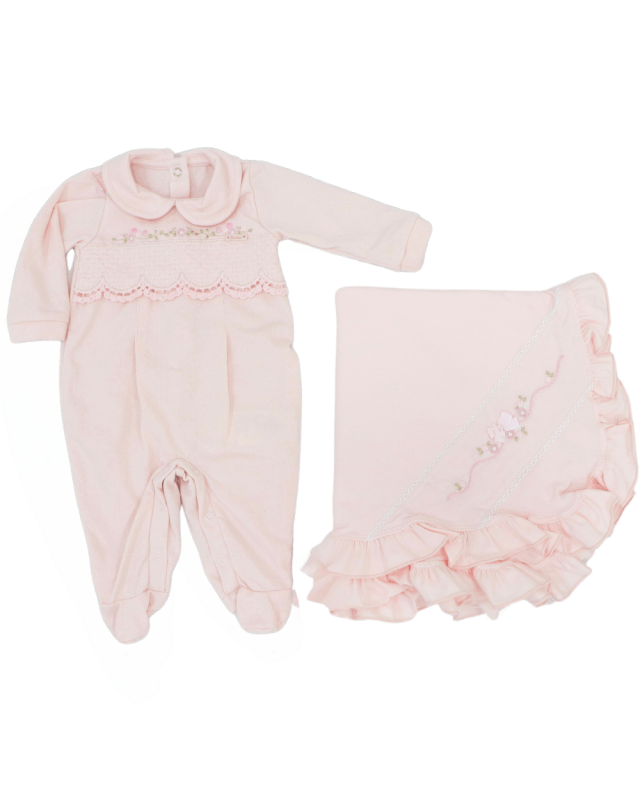 Saída de maternidade Paraíso, menina, macacão manga longa peito bordado. Acompanha manta.