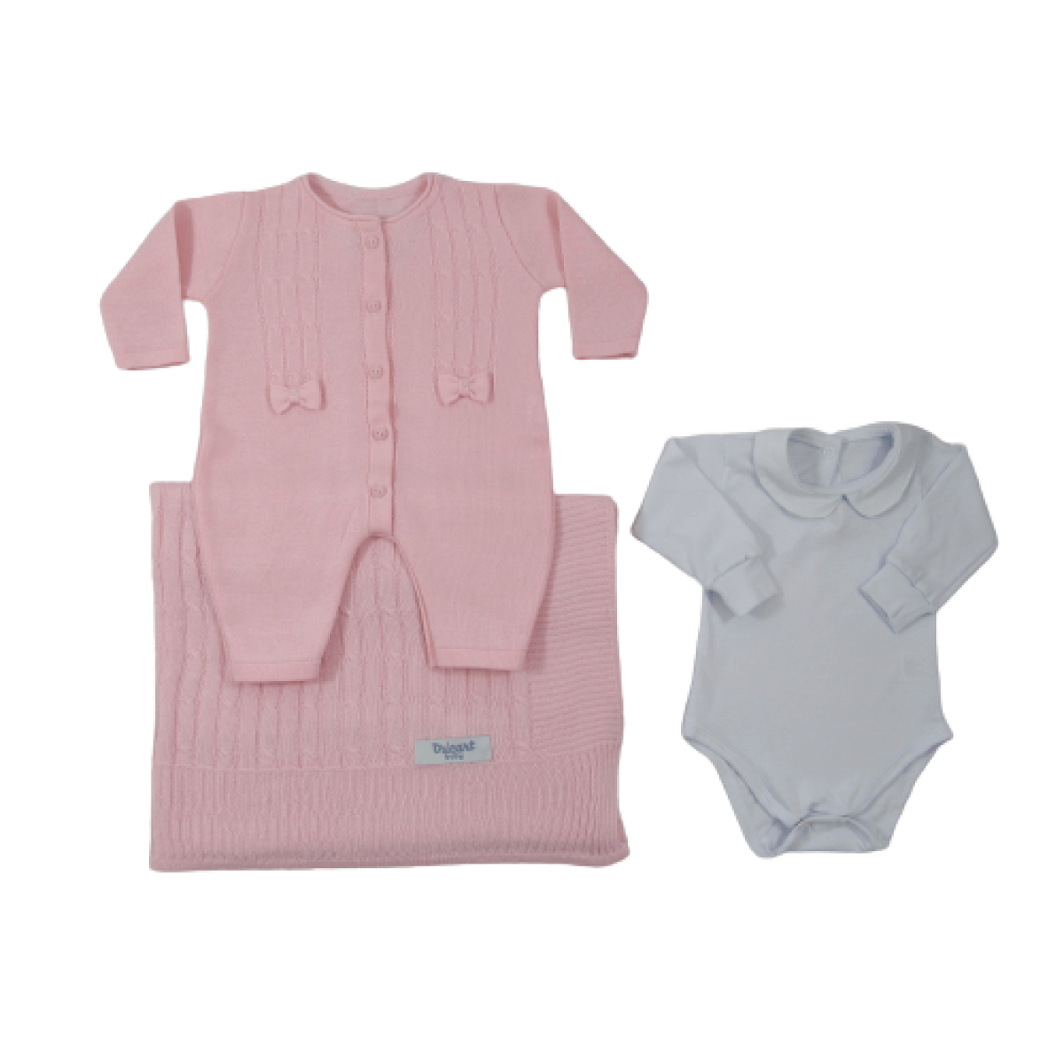Saída de maternidade ,macacão manga longa, com aplicações de laço na lateral. Acompanha manta.