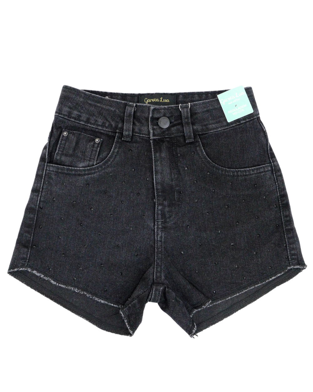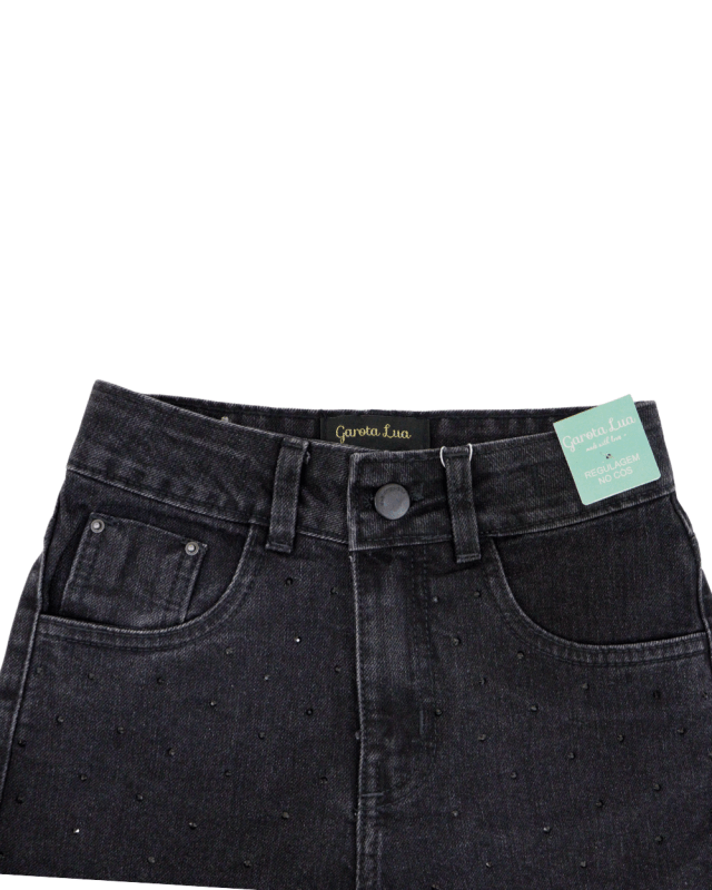 Shorts garota lua, Lavagem escura com detalhes de strass oque já o torna o queridinho dos looks, bolso frontal , passante para cinto ,bolsos traseiros com ajuste no cós e barra simples.
