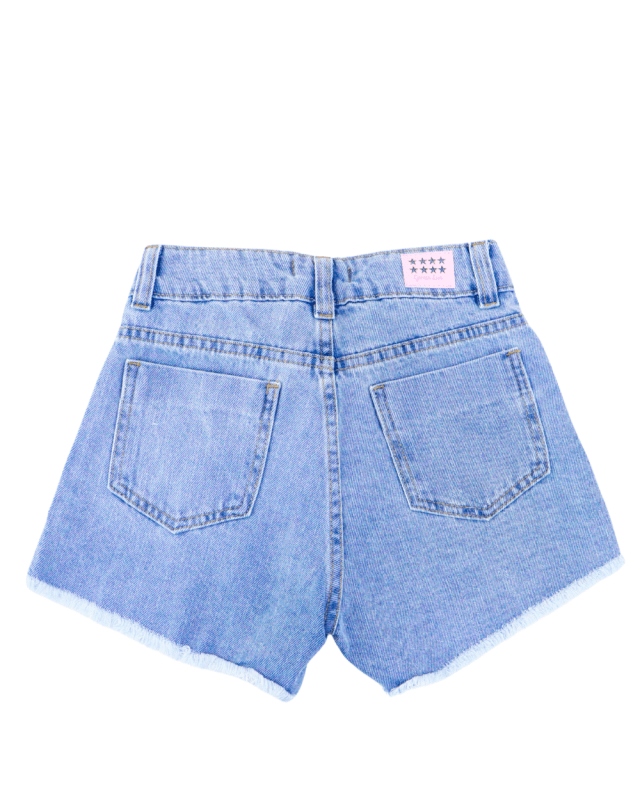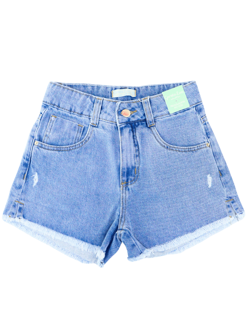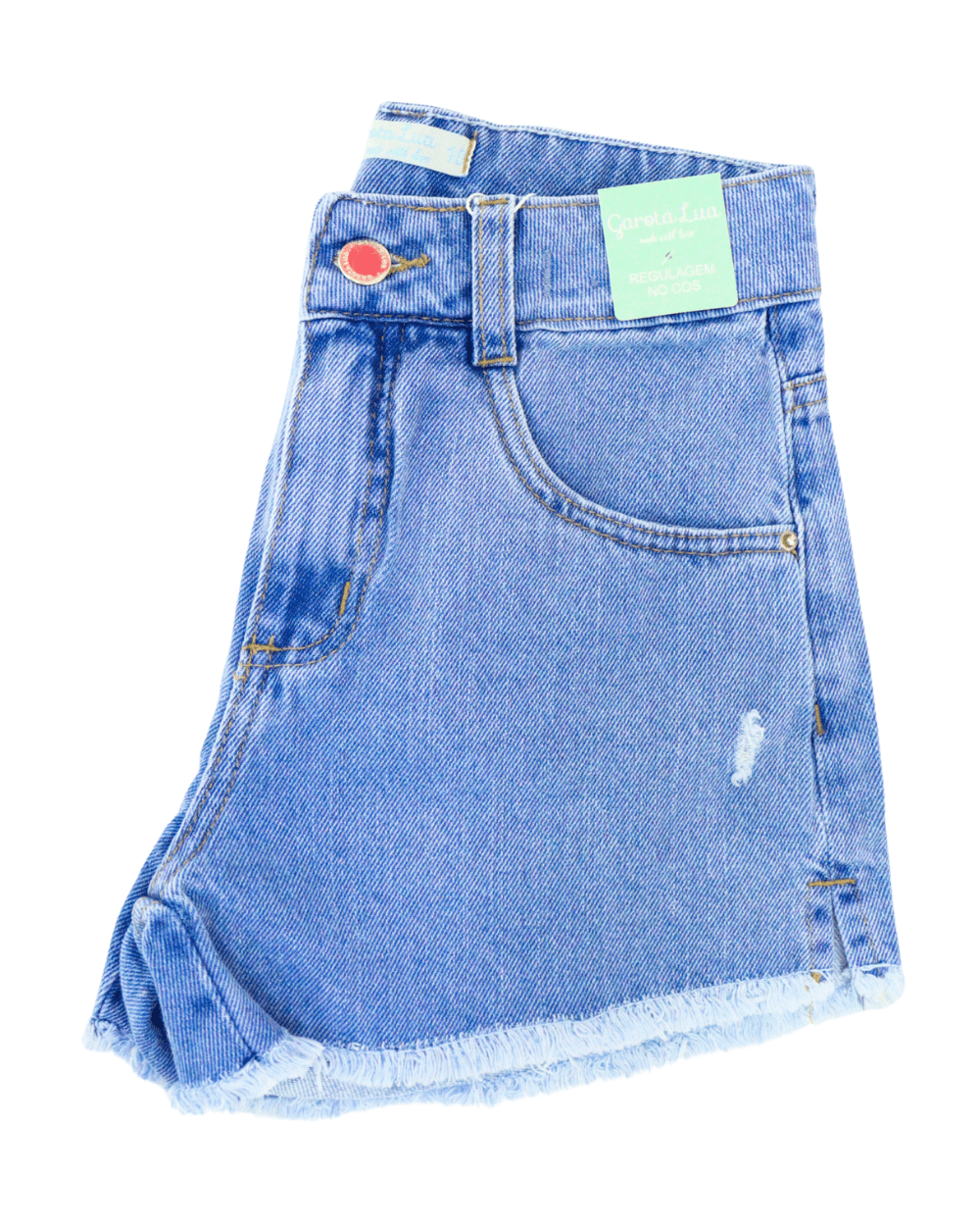 Shorts Garota lua, lavagem clara detalhes desfiados, com regulagem no cós, barra desfiada.