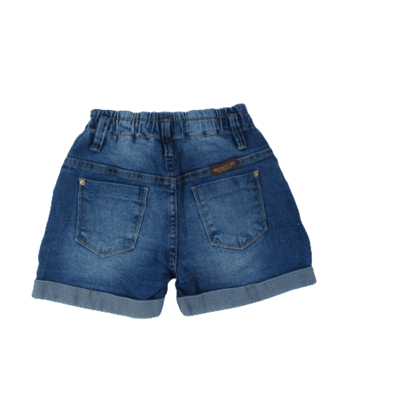 Shorts jeans feminino infantil, lavagem escura, bolso frontal, bolso traseiro costura exposta, barra dobrada, passante para cinto.