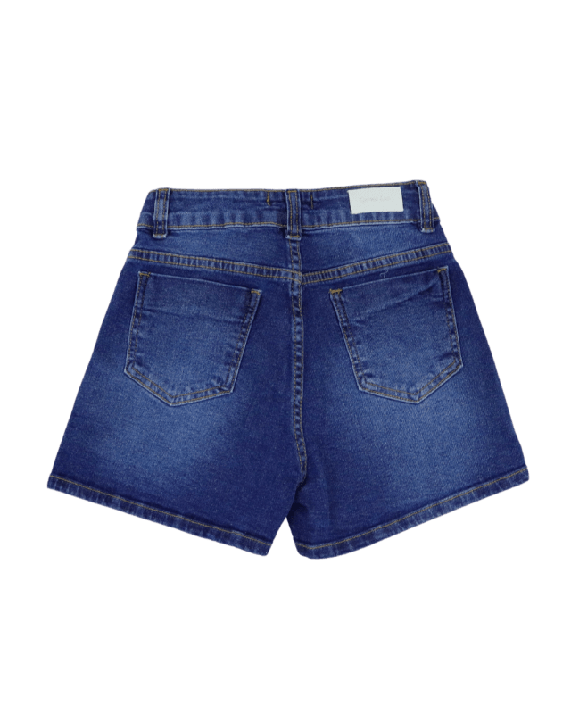 Shorts jeans ,com bolsos frontal e traseiro, fecho por botão e zíper, cós com regulagem e passante para cinto.