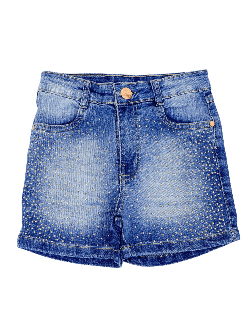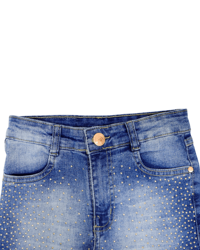Shorts Revert, Lavagem média com detalhes em strass oque já o torna o queridinho dos looks, bolso frontal , passante para cinto, barra simples, bolsos traseiros.