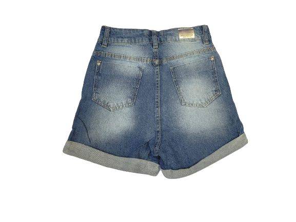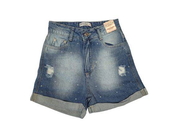 Shorts jeans feminino infantil, lavagem clara, detalhes de strass e pérolas sintéticas, bolso frontal bolsos traseiros. Cós regulagem é passante para cinto, fecho por zíper e botão. Barra simples dobrada.
