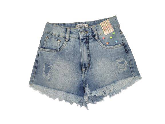 Shorts jeans feminino infantil, lavagem clara, detalhes de corações bordado, bolso frontal bolsos traseiros. Cós regulagem é passante para cinto, fecho por zíper e botão. Barra levemente desfiada.