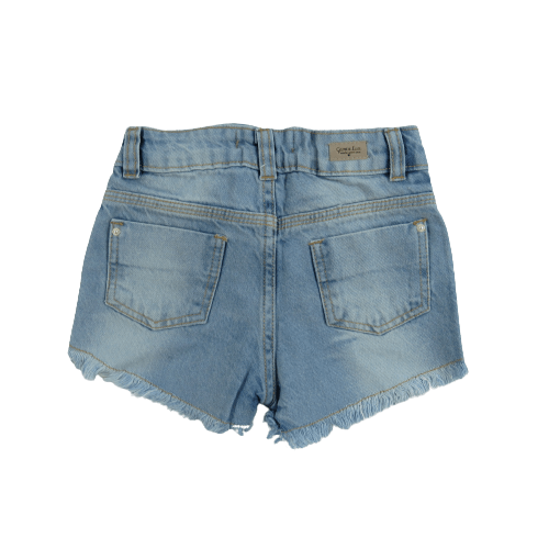 Shorts jeans feminino infantil, lavagem clara bolso frontal bolsos traseiros. Cós regulagem é passante para cinto, fecho por zíper e botão. Barra levemente desfiada.