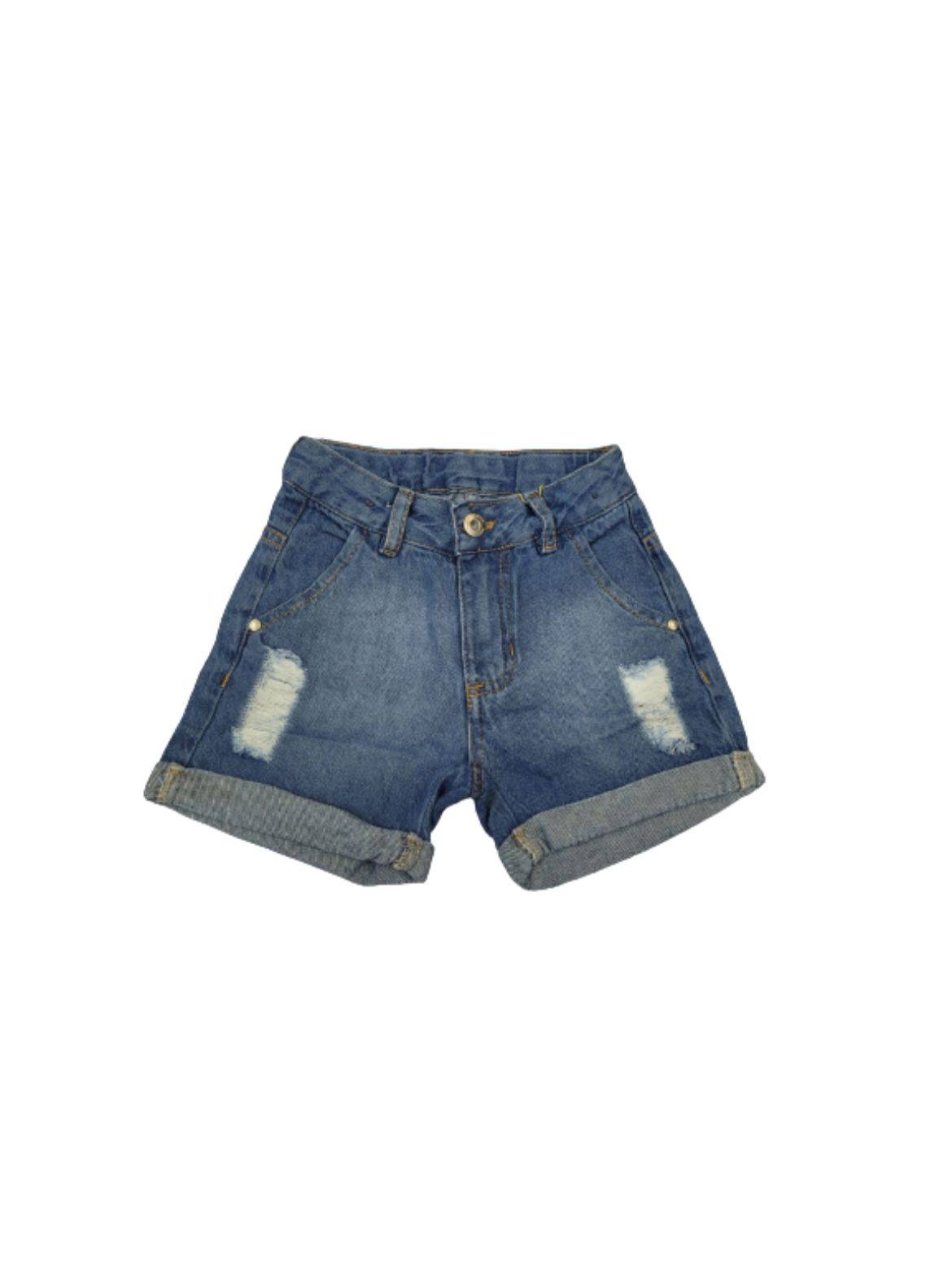 Shorts jeans feminino infantil, lavagem clara, bolso frontal bolsos traseiros. Cós regulagem é passante para cinto, fecho por zíper e botão. Barra simples dobrada.