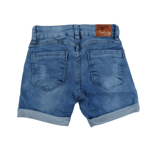 Shorts jeans feminino juvenil, lavagem clara, bolso frontal fake, bolso traseiro costura exposta, barra dobrada. Cós com regulagem interna, passante para cinto. COR.: LAVAGEM CLARA COMPOSIÇÃO.: 80% ALGODÃO 18% POLIÉSTER 2%ELASTANO