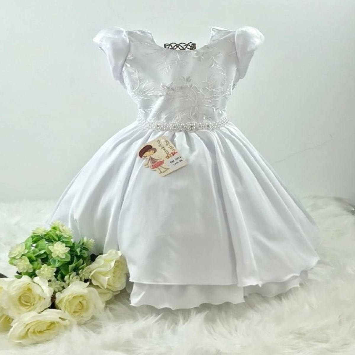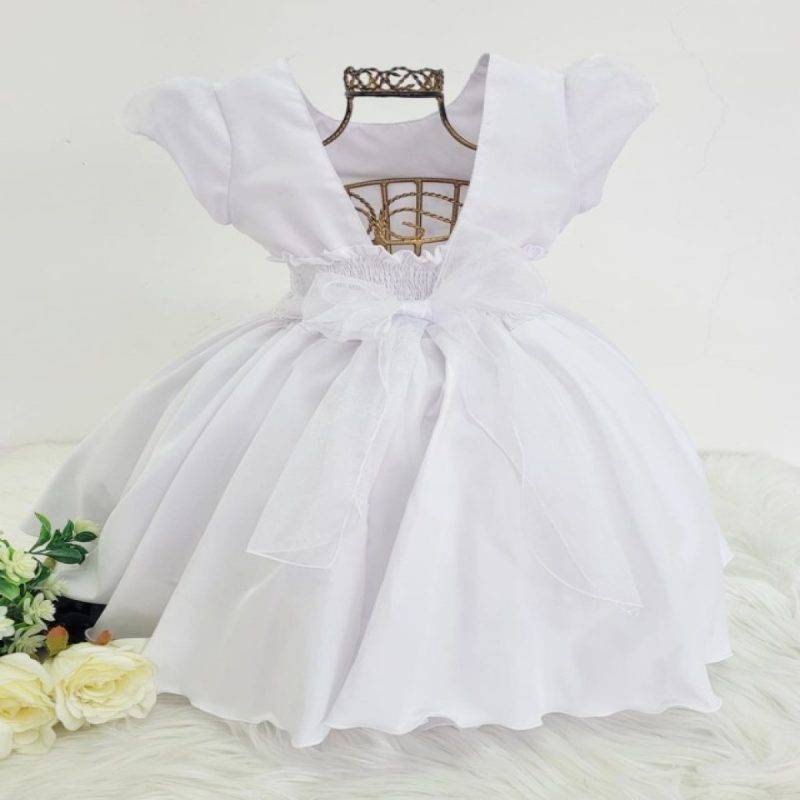 Vestido infantil manga curta com forro, peito com renda , cintura com aplicação de pérolas brancas sintéticas e strass, saia lisa, manga bufante com telinha de tule transparente.Elástico ajustável ao corpo.
