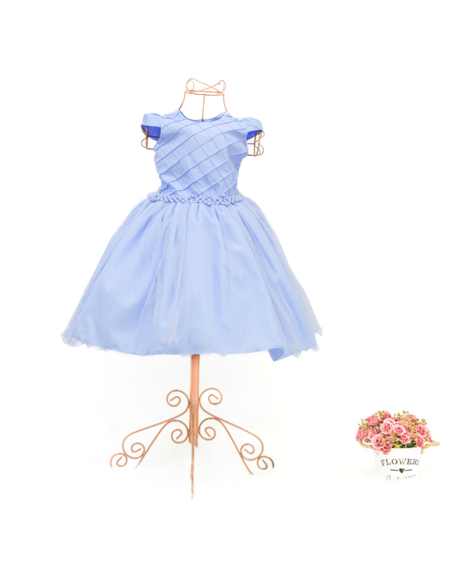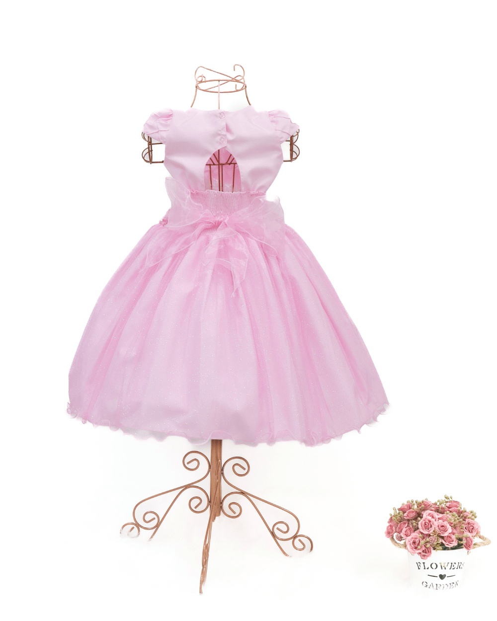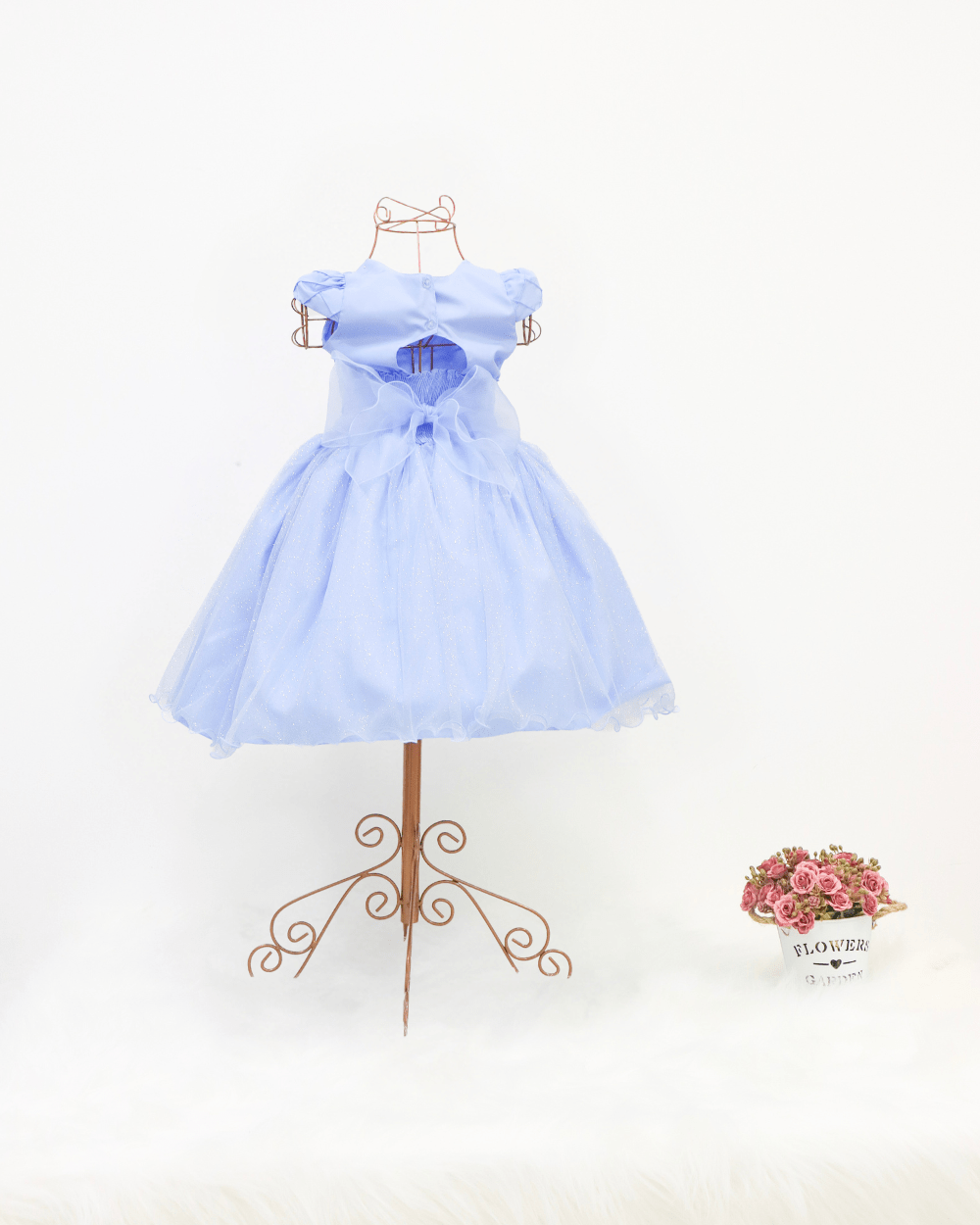 Vestido Bambina, com manga curta, em seu peito tem strass no modelo casa de abelha, saia em tule com brilho, cinto em pérolas e costa elástica para melhor se ajustar ao corpinho da criança.