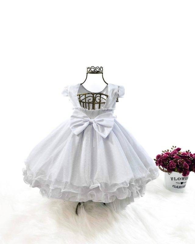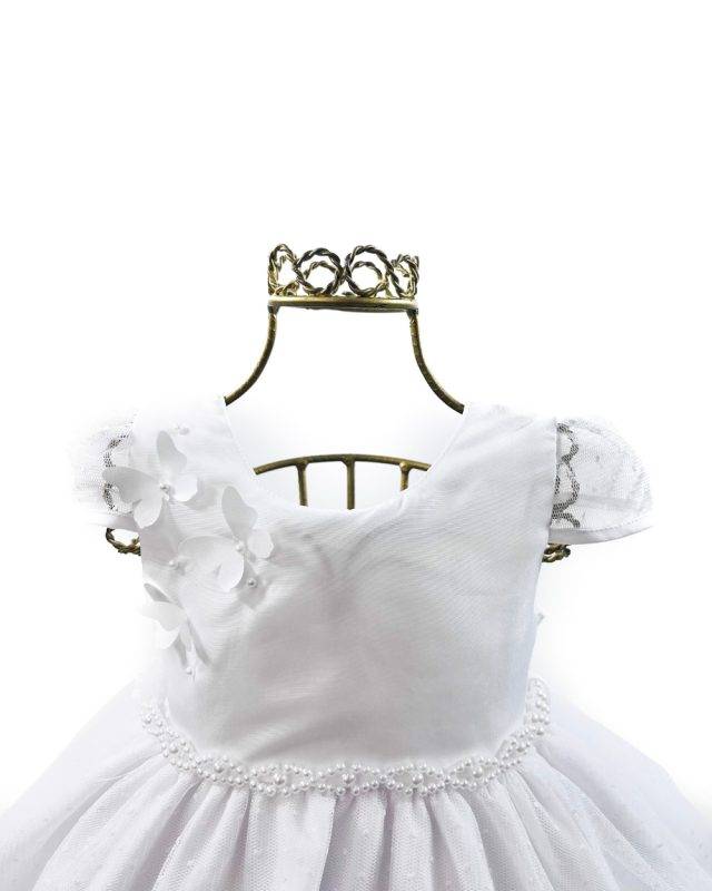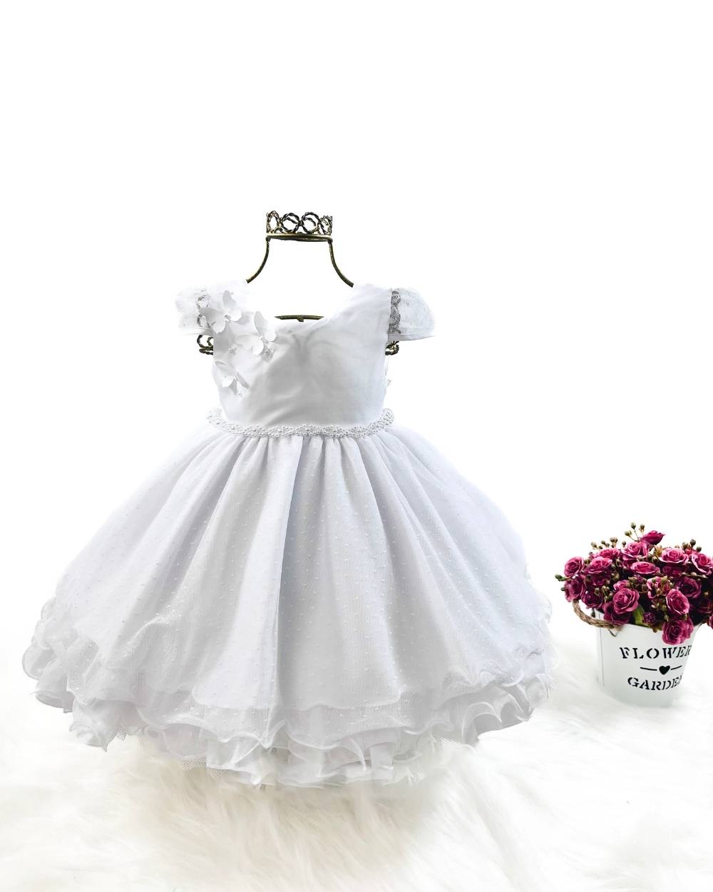 Vestido Menina Bonita, saia de tule com pôa, peito com aplicação borboleta, cinto de pérolas, manga curta, costas aberta e laço das costas removível. Composição: 100% Poliéster Cor: Branco
