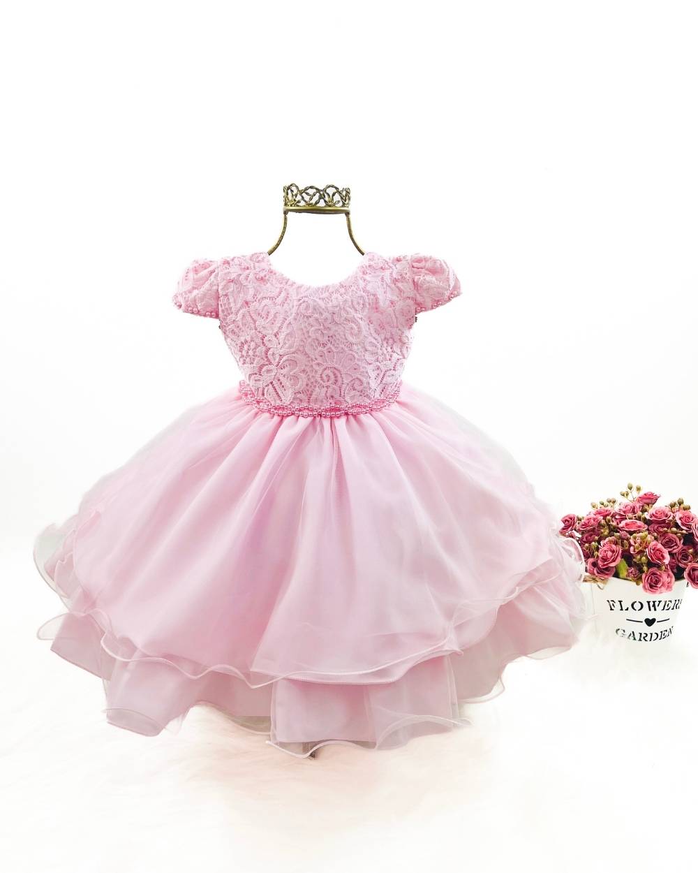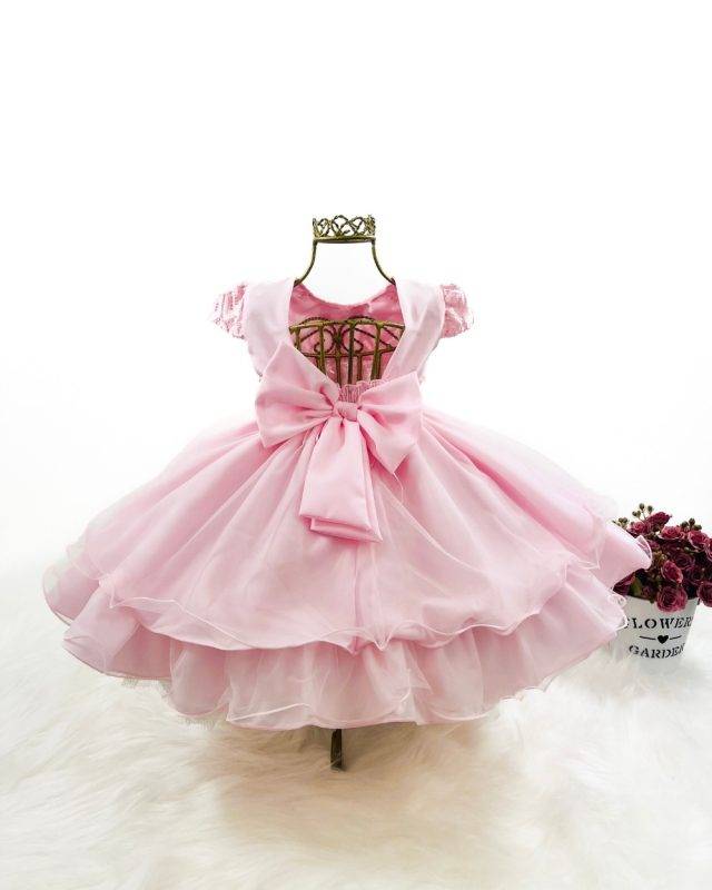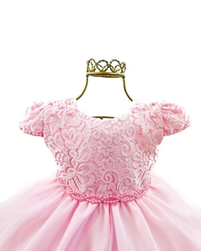 Vestido Caracoles com peito de renda e manga curta, cor de rosa, saia em tule costas com elástico, cinto de pérolas podendo remover, e laço removível nas costas.
