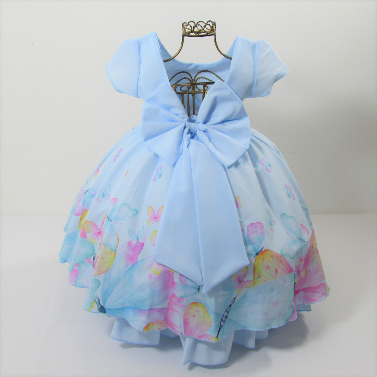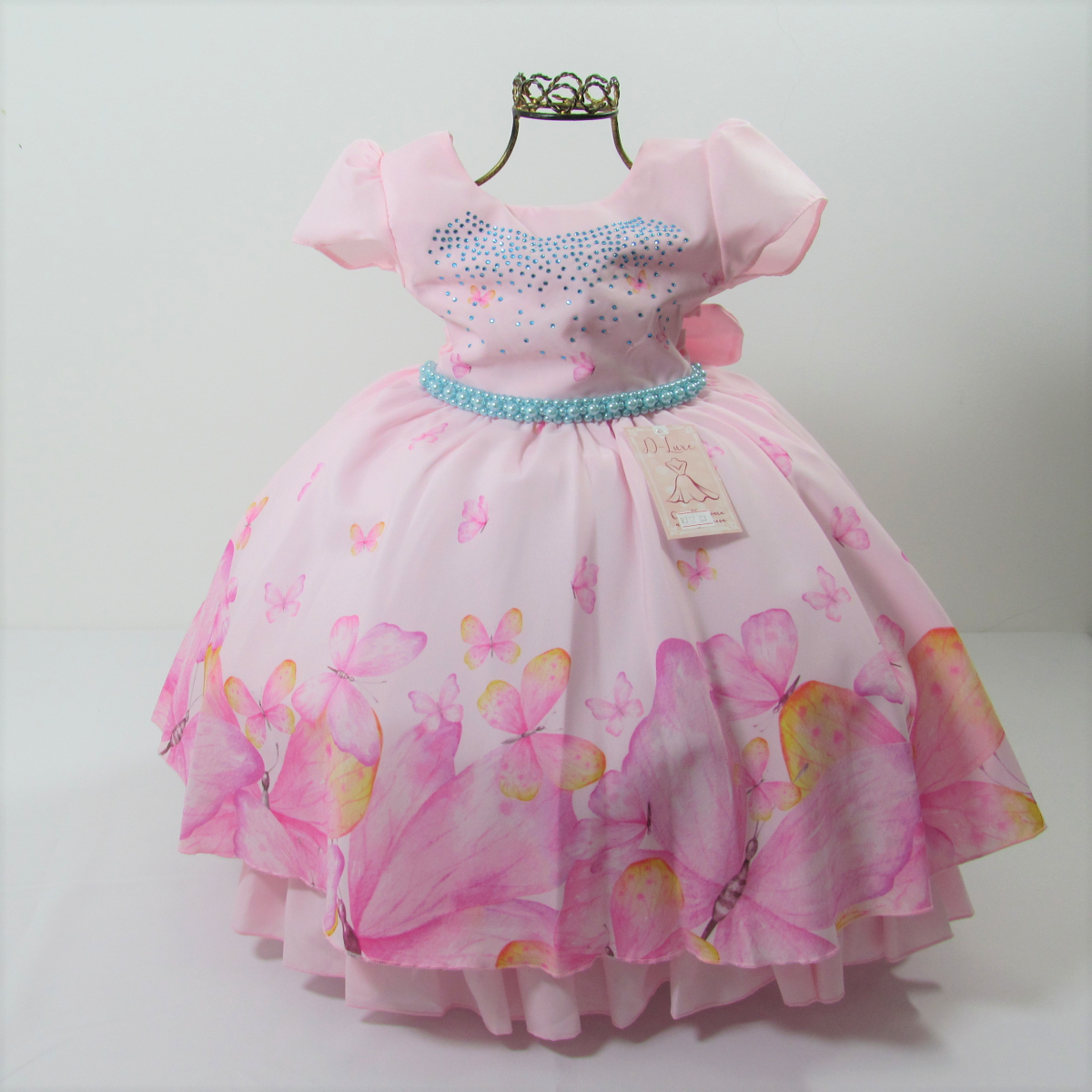 VESTIDO MANGA CURTA, PEITO COM STRASS, ESTAMPA BORBOLETAS ,CINTO DE PÉROLAS SINTÉTICAS, LAÇO TRASEIRO ,ELÁSTICO NAS COSTAS AJUSTÁVEL AO CORPO. COR: ROSA/AZUL CLARO