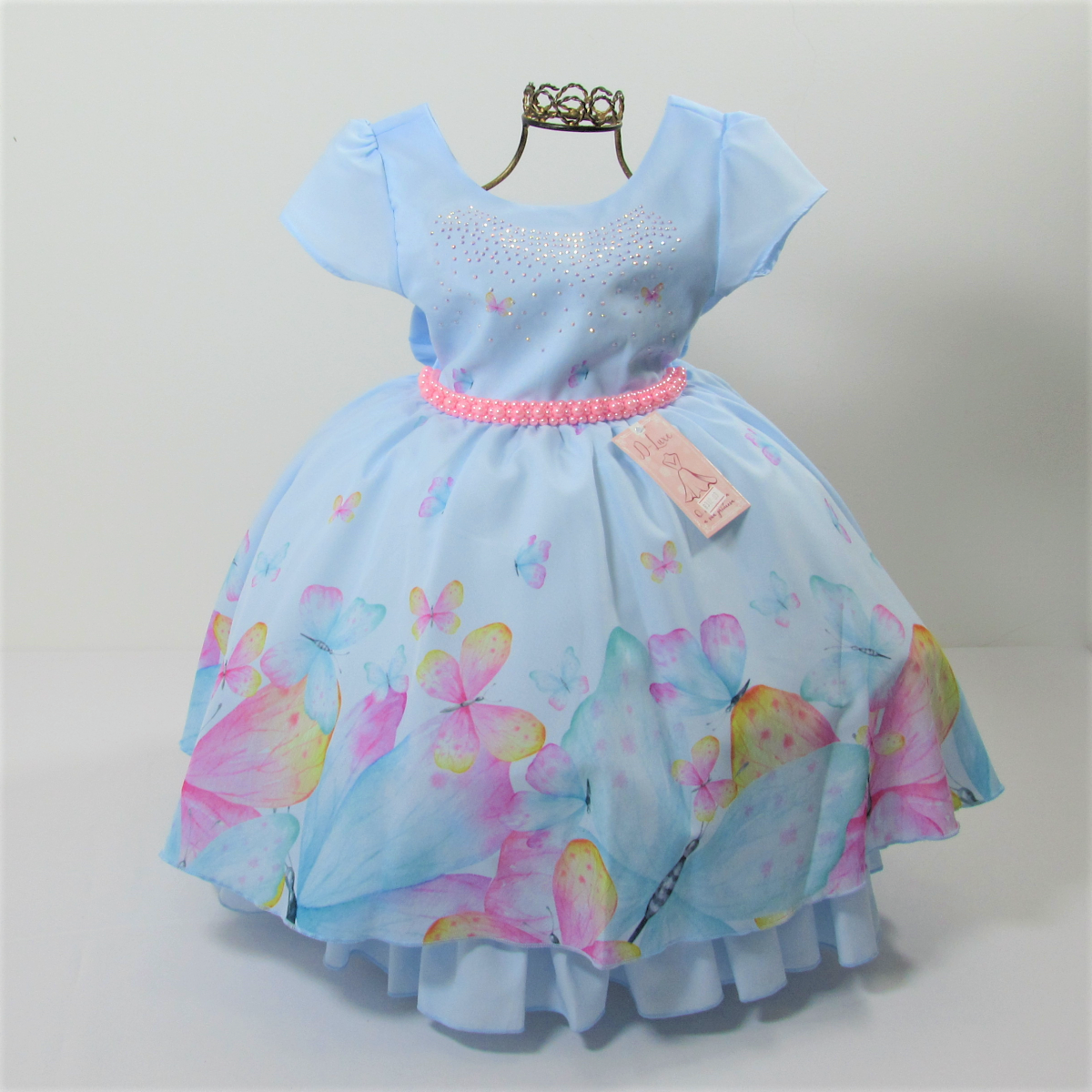 VESTIDO MANGA CURTA, PEITO COM STRASS, ESTAMPA BORBOLETAS ,CINTO DE PÉROLAS SINTÉTICAS, LAÇO TRASEIRO ,ELÁSTICO NAS COSTAS AJUSTÁVEL AO CORPO. COR: ROSA/AZUL CLARO
