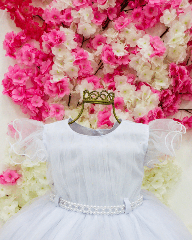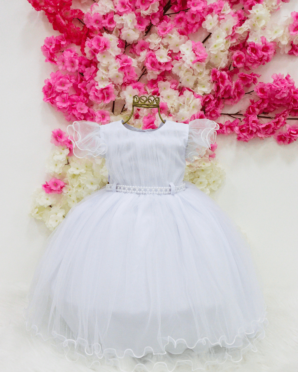 Vestido, manga curta, com peito rendado super delicado saia em tule, cinto de pérolas e costa elástica para melhor ajuste ao corpo.