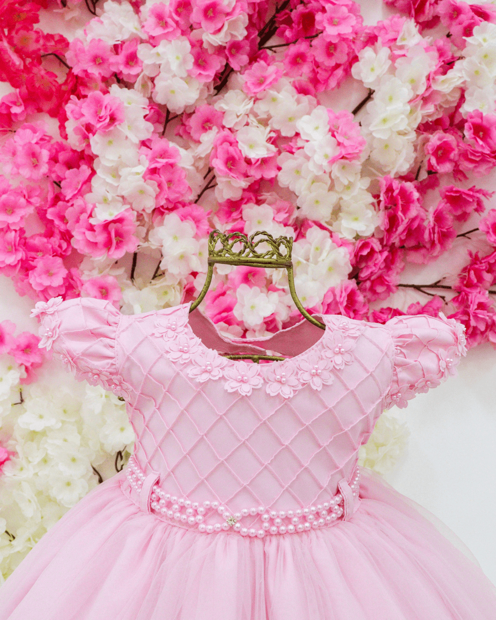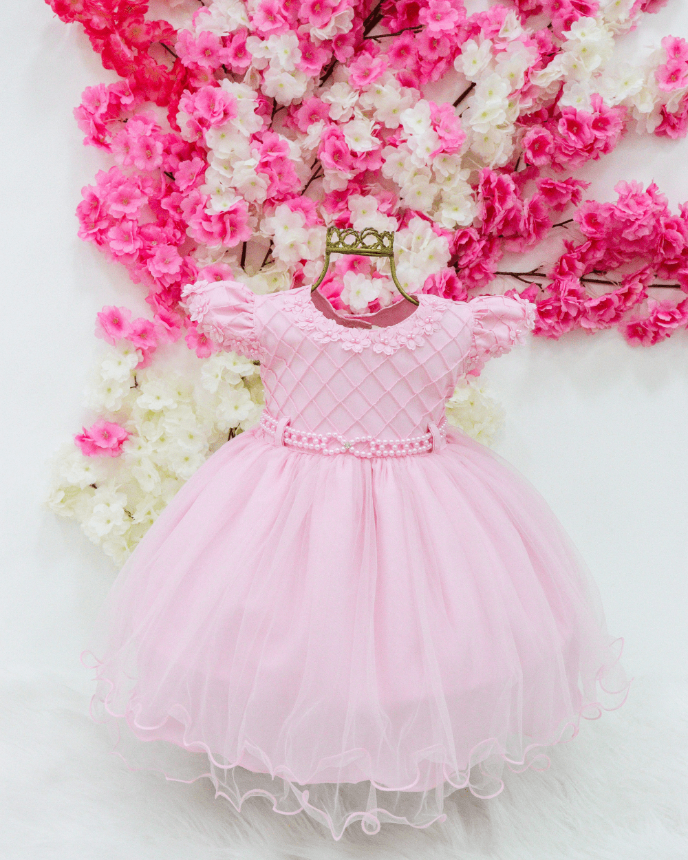 Vestido, manga curta, com peito rendado super delicado saia em tule, cinto de pérolas e costa elástica para melhor ajuste ao corpo.