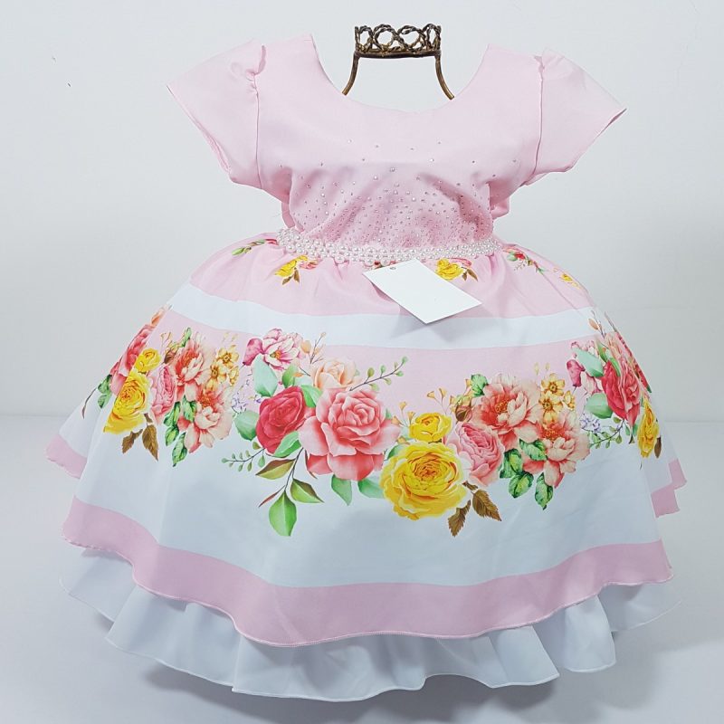 VESTIDO MANGA CURTA PEITO COM STRASS, ESTAMPA FLORAL ,PÉROLAS SINTÉTICAS.LAÇO TRASEIRO. ELÁSTICO NAS COSTAS AJUSTÁVEL AO CORPO. DISPONÍVEL NA COR:ROSA/AZUL