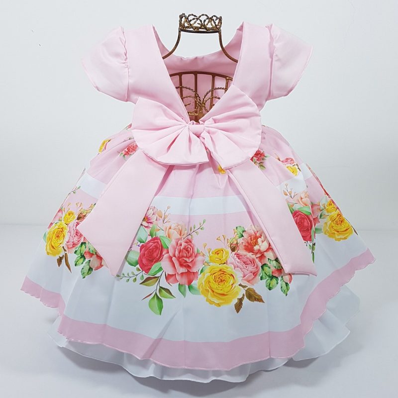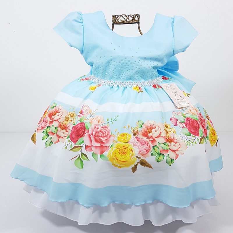 VESTIDO MANGA CURTA PEITO COM STRASS, ESTAMPA FLORAL ,PÉROLAS SINTÉTICAS.LAÇO TRASEIRO. ELÁSTICO NAS COSTAS AJUSTÁVEL AO CORPO. DISPONÍVEL NA COR:ROSA/AZUL