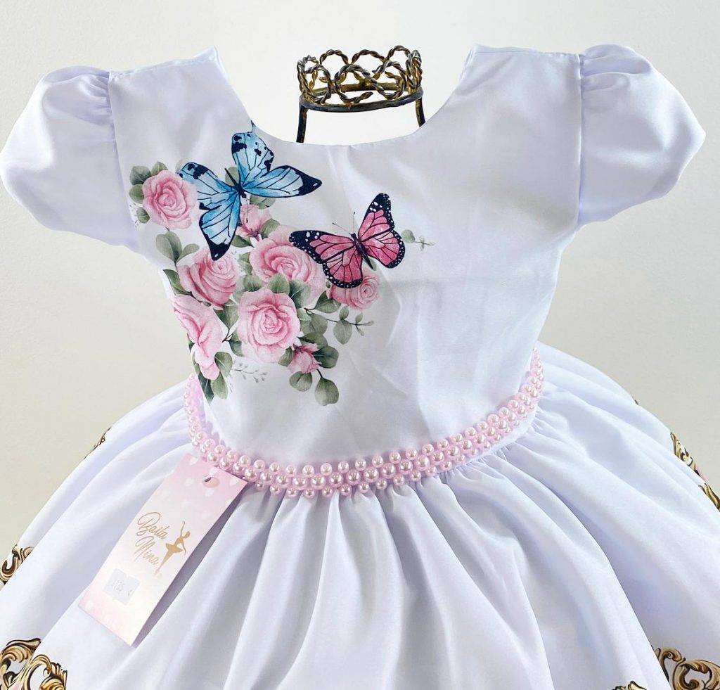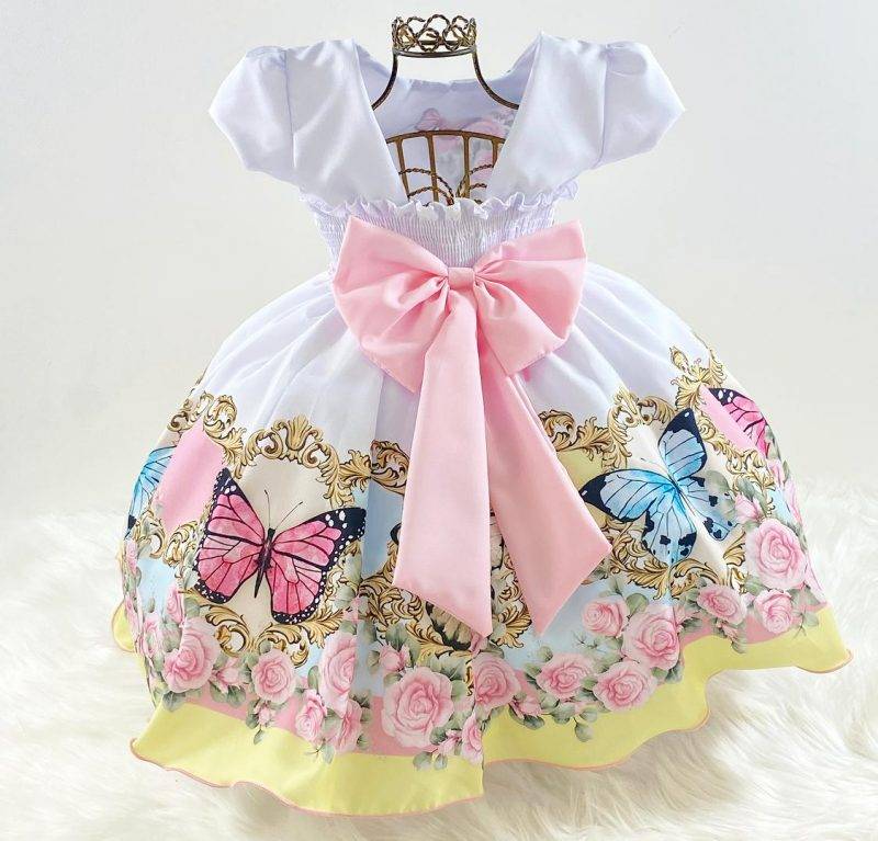 Vestido infantil manga curta com forro, peito com liso, saia estampa jardim borboletas, cintura com pérolas. Elástico nas costas ajustável ao corpo e laço.