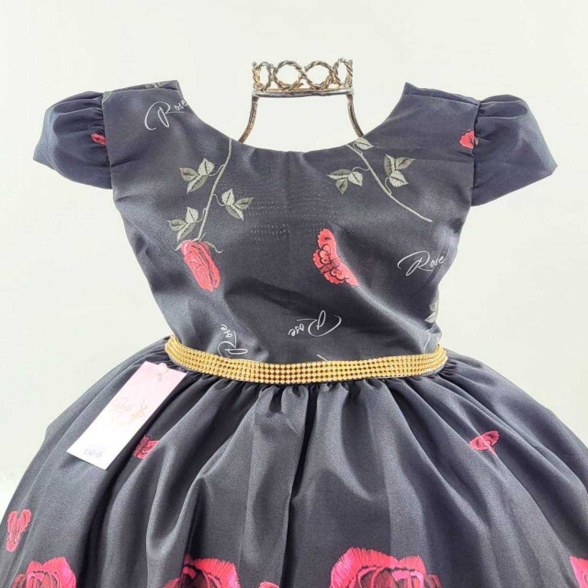 Vestido infantil manga curta, fundo preto , estampa rosas vermelhas ,cintura com strass dourada sintéticas. saia acabamento simples ,elástico nas costas ajustável ao corpo e laço.