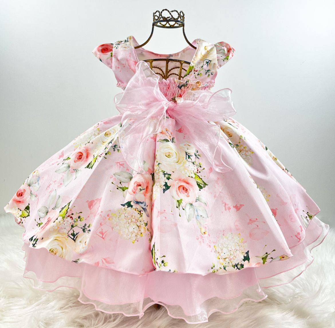 Vestido infantil manga curta com forro, estampa floral, cintura cintinho de pérolas sintéticas .Elástico nas costas ajustável ao corpo e laço.