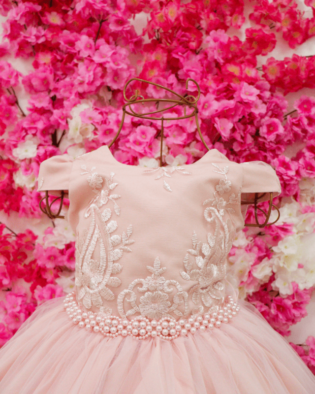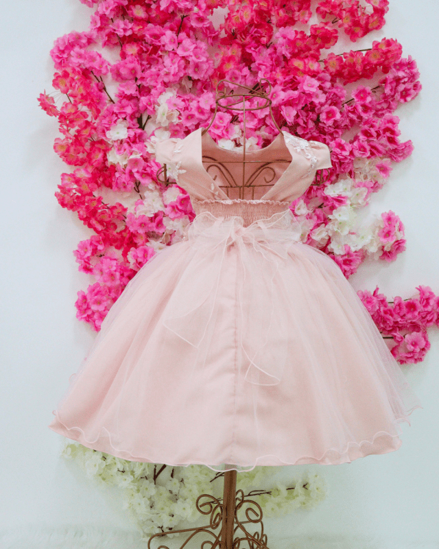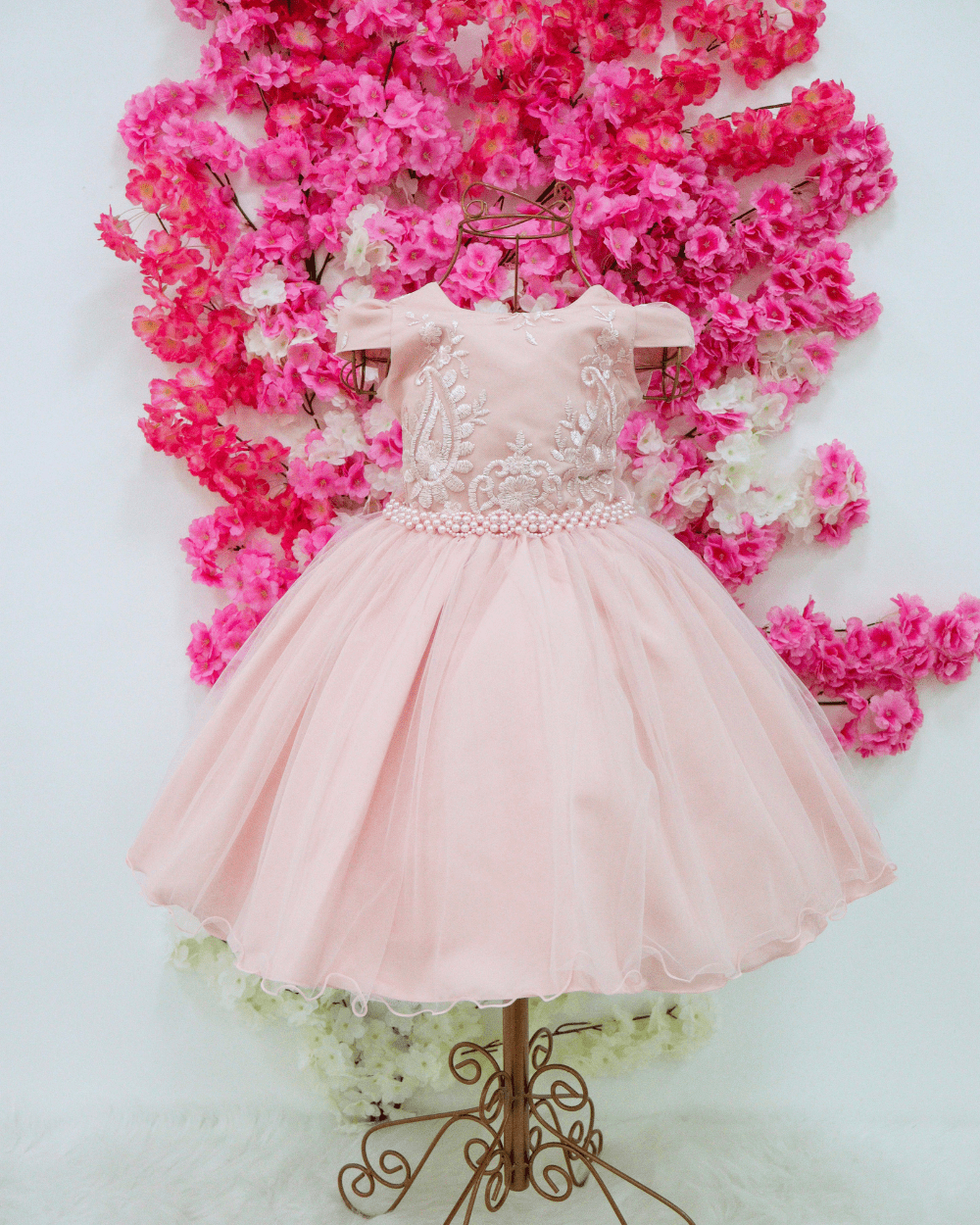Vestido infantil manga curta, peito com aplicações em pérolas, saia lisa com tule. Cintura com pérolas sintéticas. Elástico nas costas ajustável ao corpo.