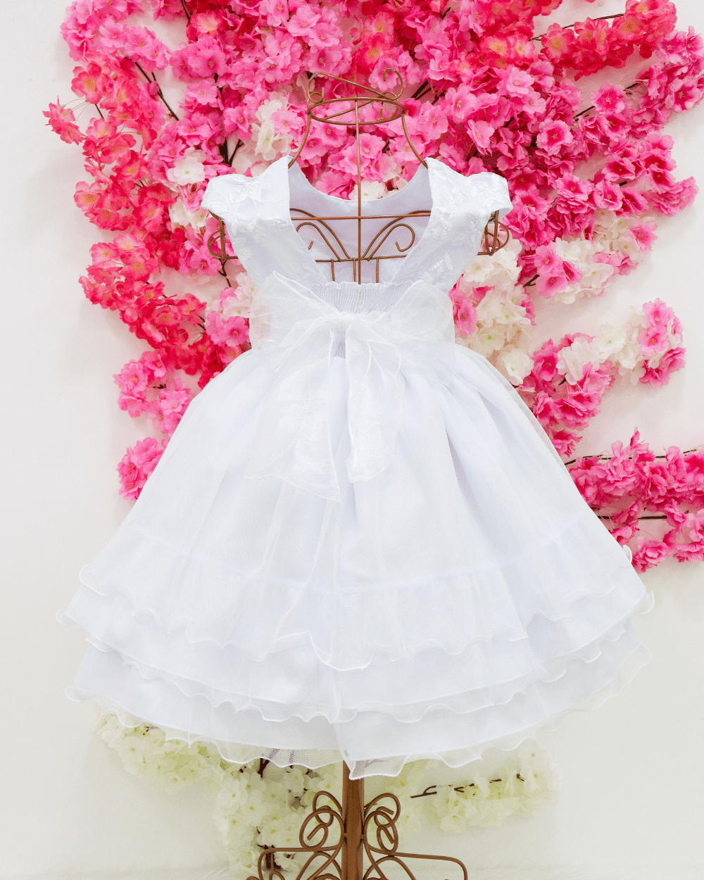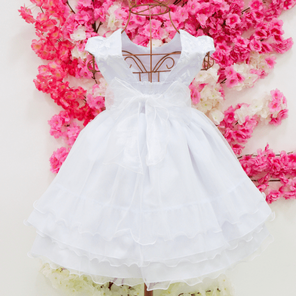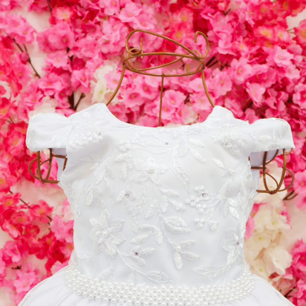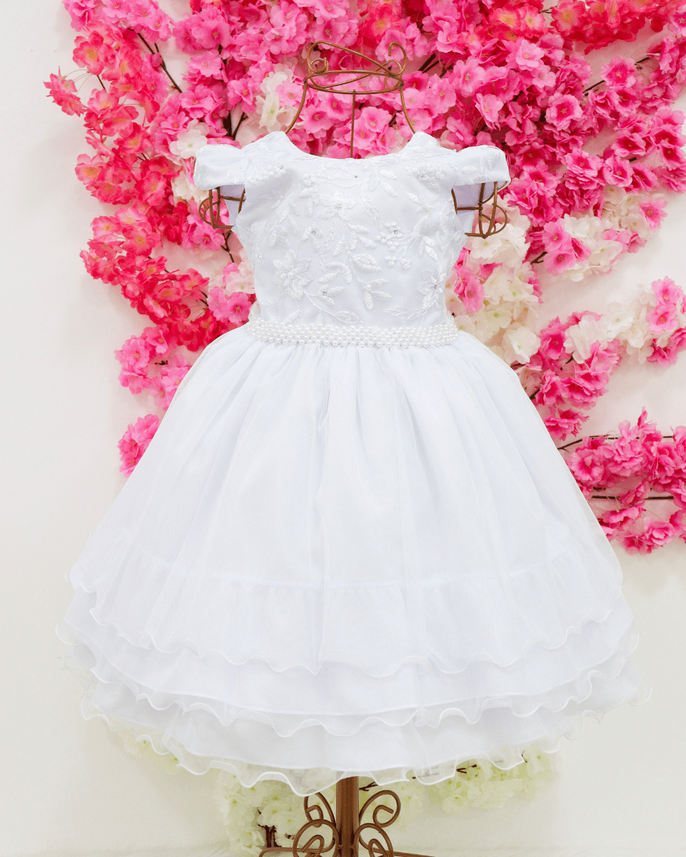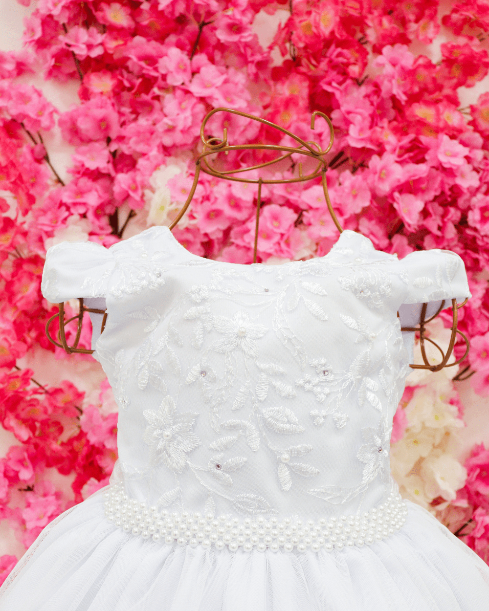 MANGA CURTA,CINTO DE PÉROLA, LAÇO TRASEIRO.