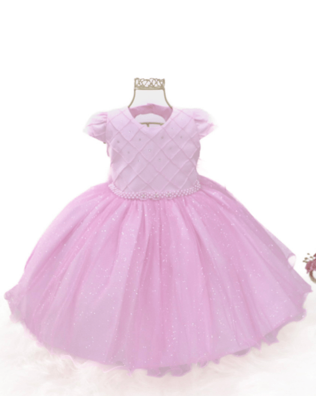 Vestido Bambina, manga curta com saia de tule em brilho, peito casa de abelha com aplicações de strass, cinto em pérolas não removível e costas com elástico para melhor ajuste ao corpo.Disponível em duas lindas cores.
