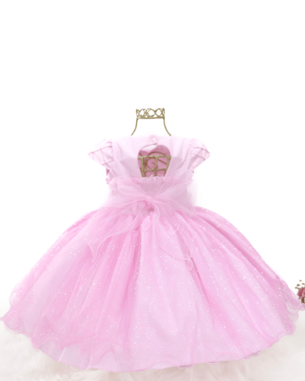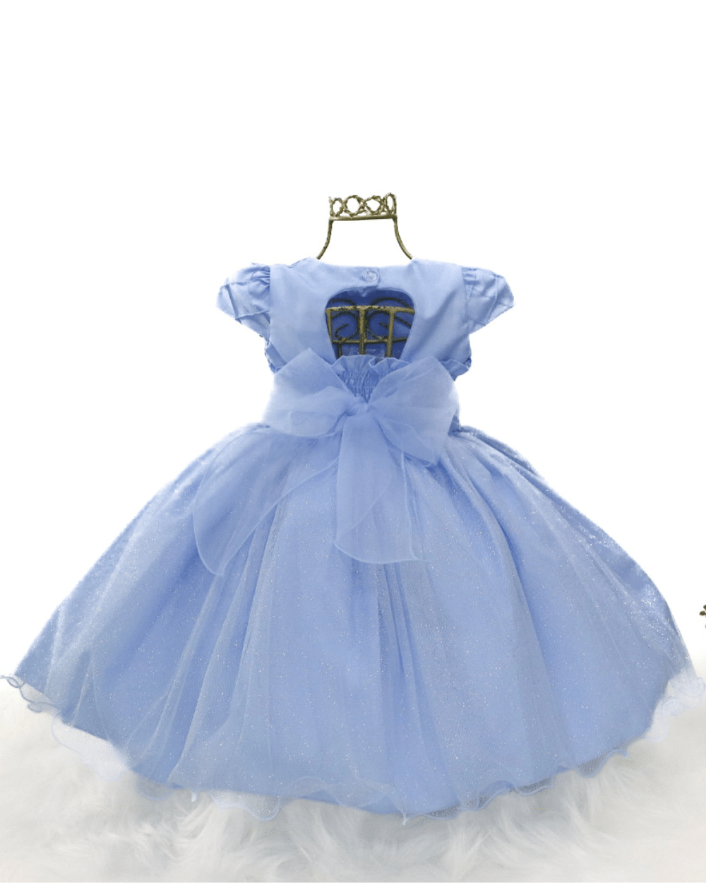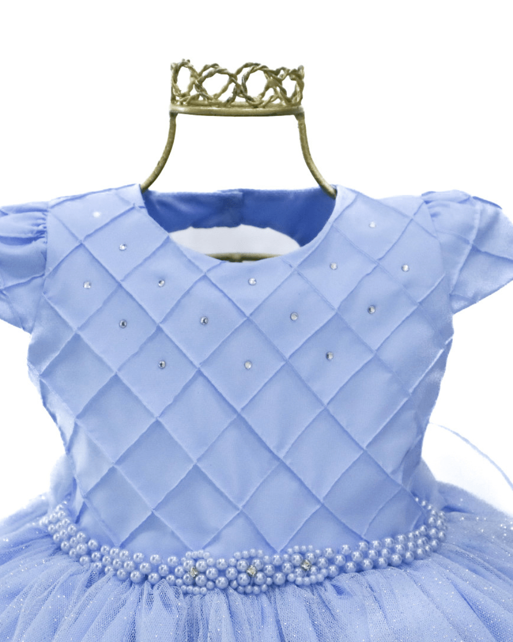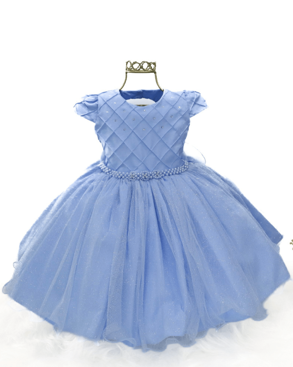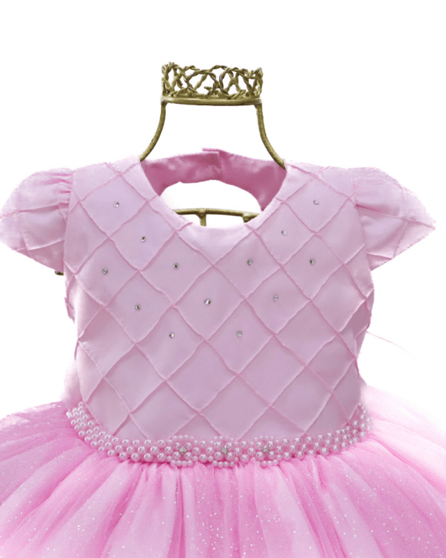 Vestido Bambina, manga curta com saia de tule em brilho, peito casa de abelha com aplicações de strass, cinto em pérolas não removível e costas com elástico para melhor ajuste ao corpo.Disponível em duas lindas cores.