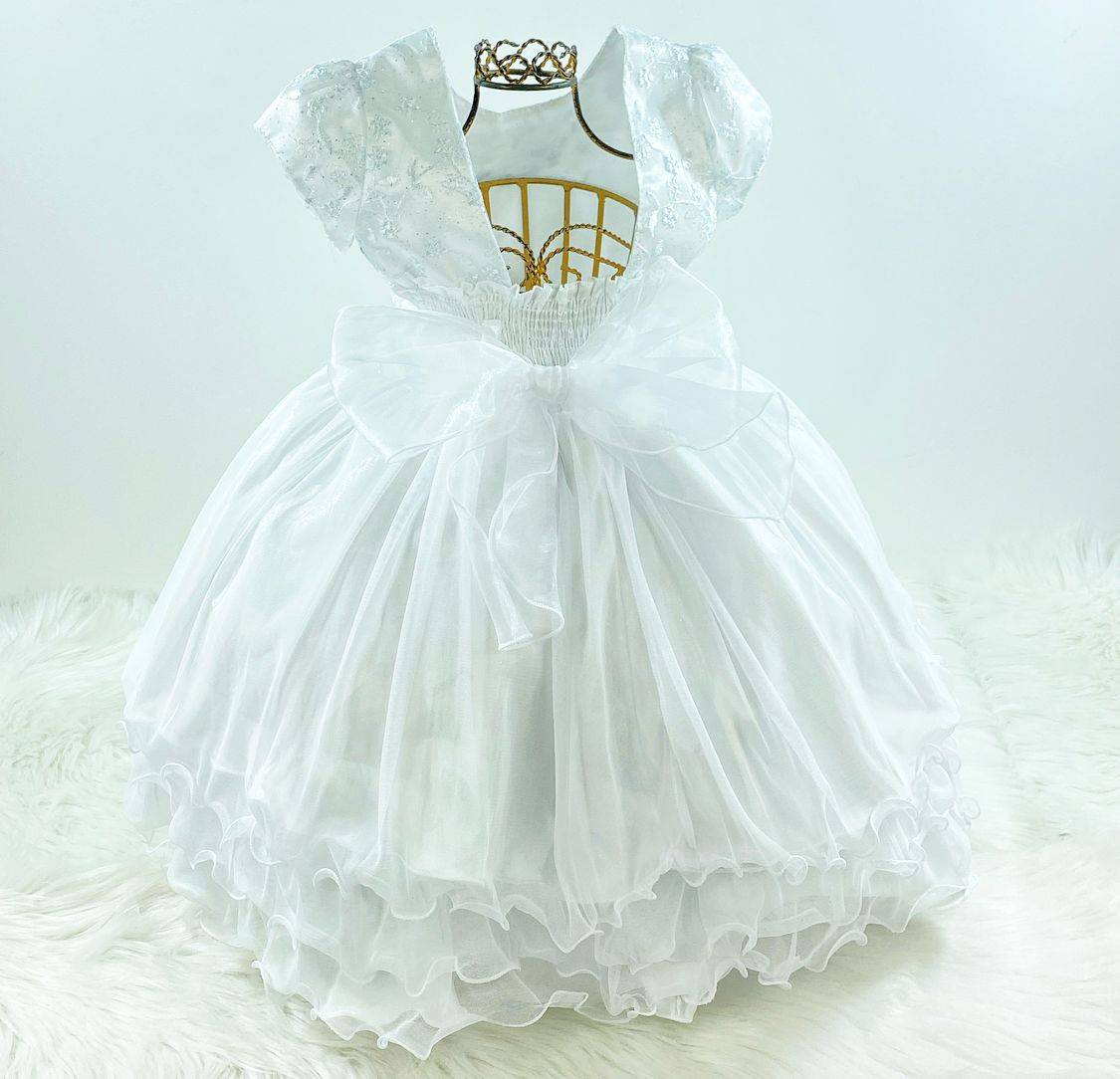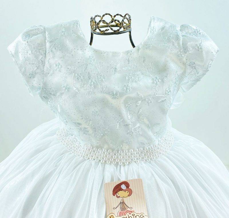 Vestido infantil manga curta, peito com renda, saia lisa acabamento simples . Cintura com bordado de pérolas sintéticas. Nas costas contém elástico ajustável ao corpo e faixa.