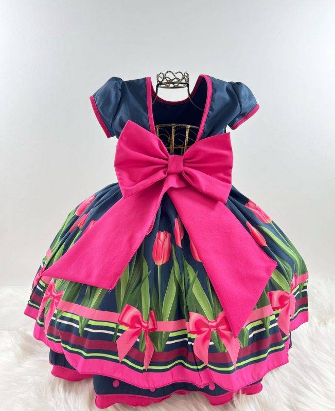 Vestido manga curta infantil festa, peito liso, Cintura bordada pérolas sintéticas, saia floral com acabamento babado tule. Elástico nas costas ajustável ao corpo e faixa para ajuste.