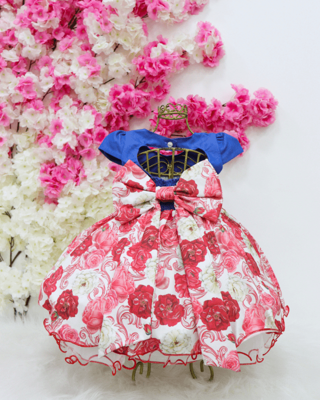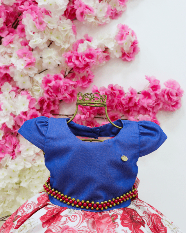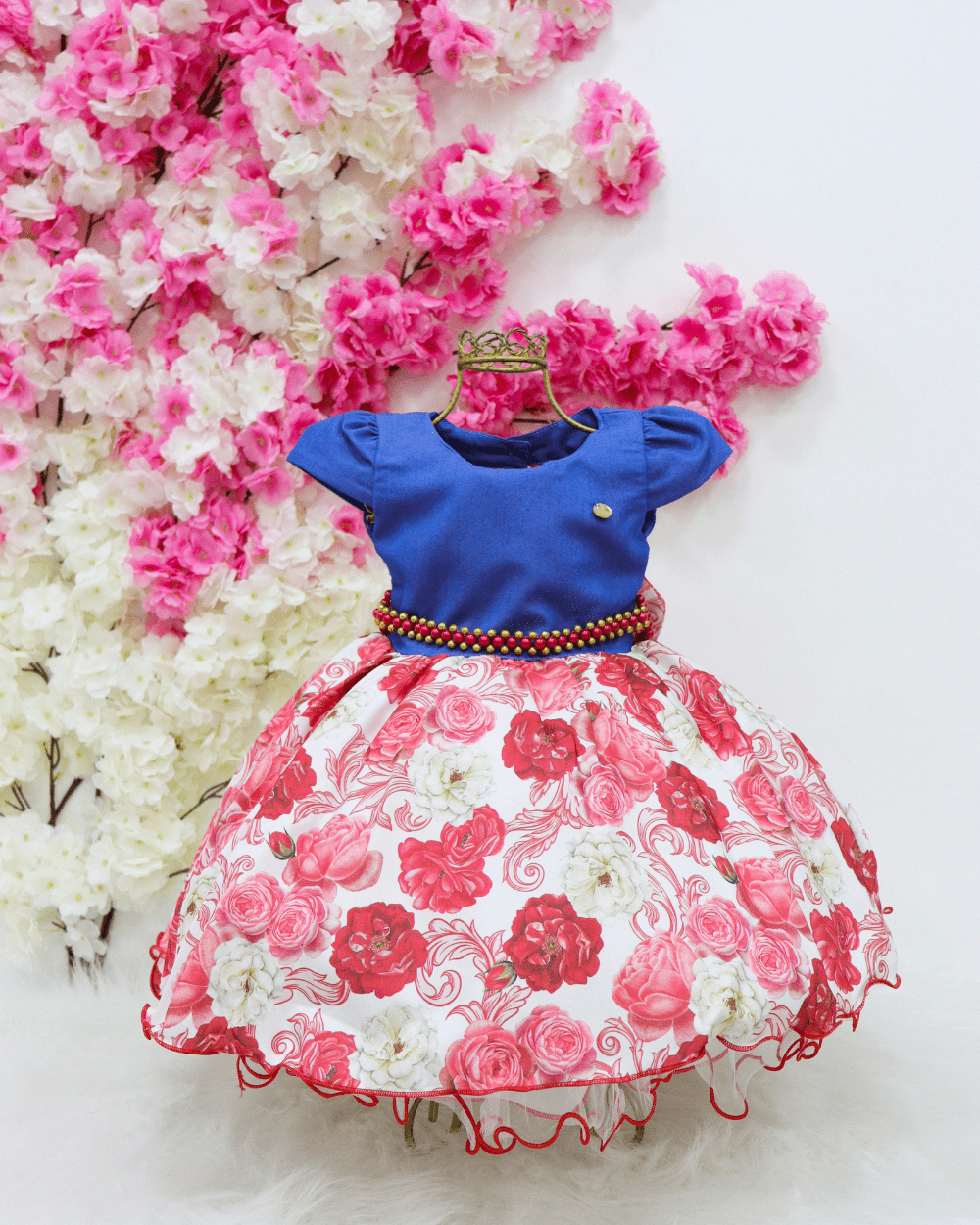Vestido infantil manga curta, peito jeans, saia estampa floral. Cintura com cinto de pérolas sintéticas. Laço e elástico nas costas ajustável ao corpo e laço.