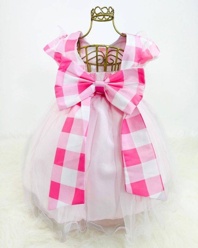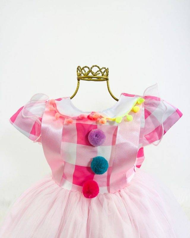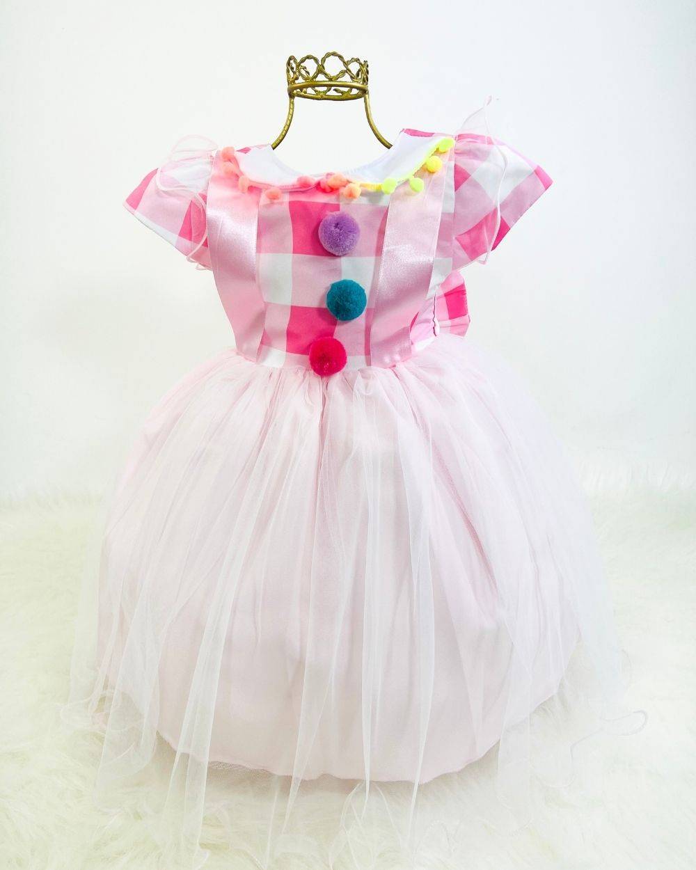 Vestido manga curta infantil, peito quadriculado e aplicações com de detalhes de pom pom e gola. Saia com camada de tule transparente. Elástico nas costas ajustável ao corpo.