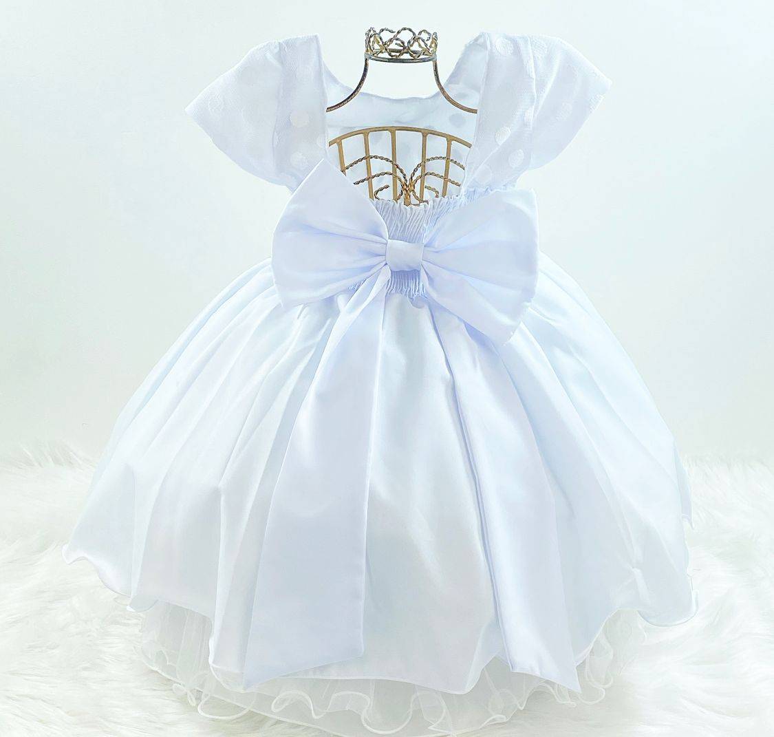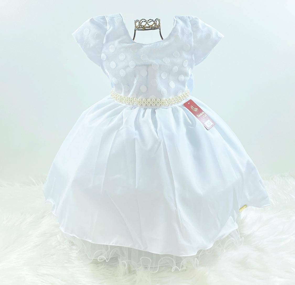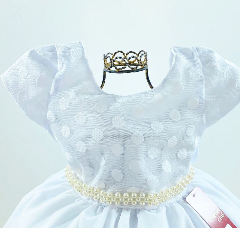 Vestido infantil manga curta, peito rendado com detalhes de bolinhas. Cintura bordada com pérolas sintéticas, saia lisa, elástico nas costas ajustável ao corpo com laço.