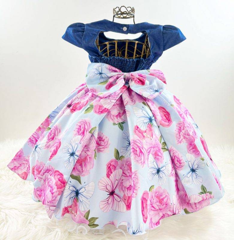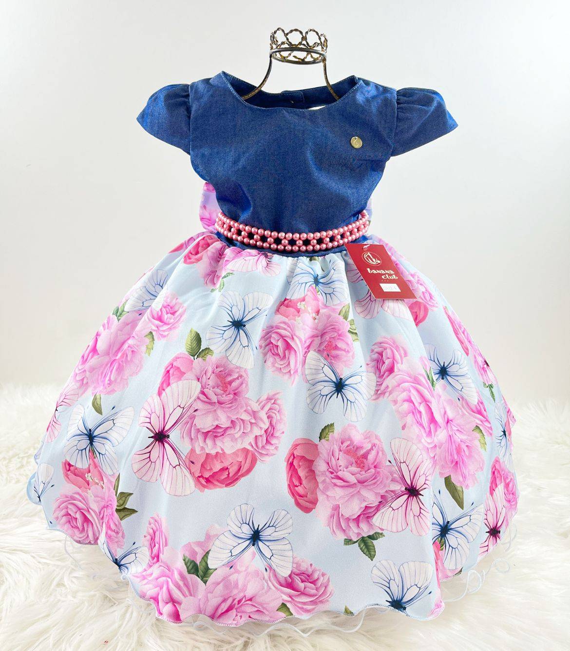 Vestido infantil manga curta, peito jeans, saia estampa floral. Cintura com cinto de pérolas sintéticas. Laço e elástico nas costas ajustável ao corpo e laço.