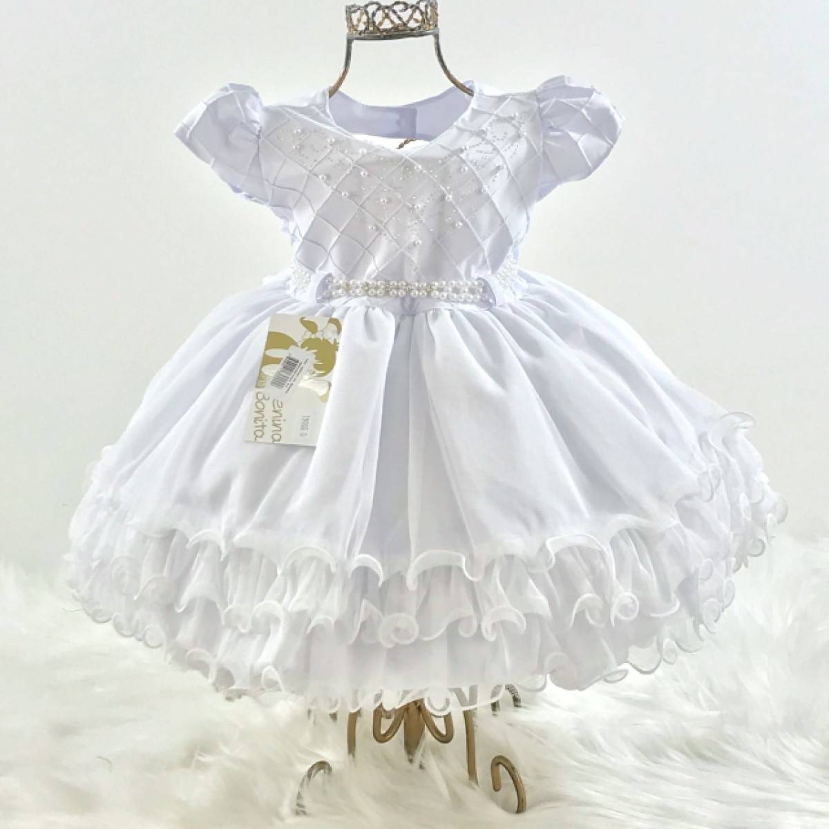 VESTIDO MANGA CURTA PEITO QUADRICULADO BORDADO PÉROLAS SINTÉTICAS, SAIA LISA COM BABADO TULE, CINTO DE PÉROLAS SINTÉTICAS, LAÇO TRASEIRO ,ELÁSTICO NAS COSTAS AJUSTÁVEL AO CORPO.