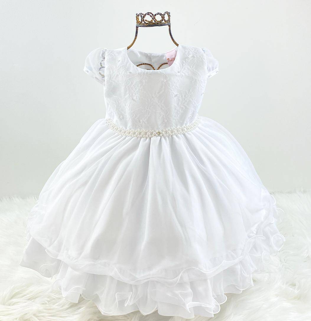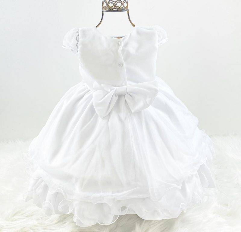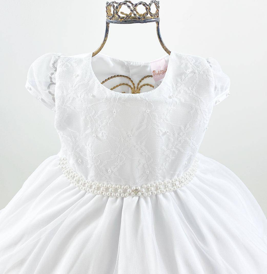 Vestido infantil manga curta tule transparente,peito com renda ,peito e cintura bordado com pérolas sintéticas brancas,saia lisa com camada de tule.Contém fecho nas costas por botões e laço. Cor: Branco