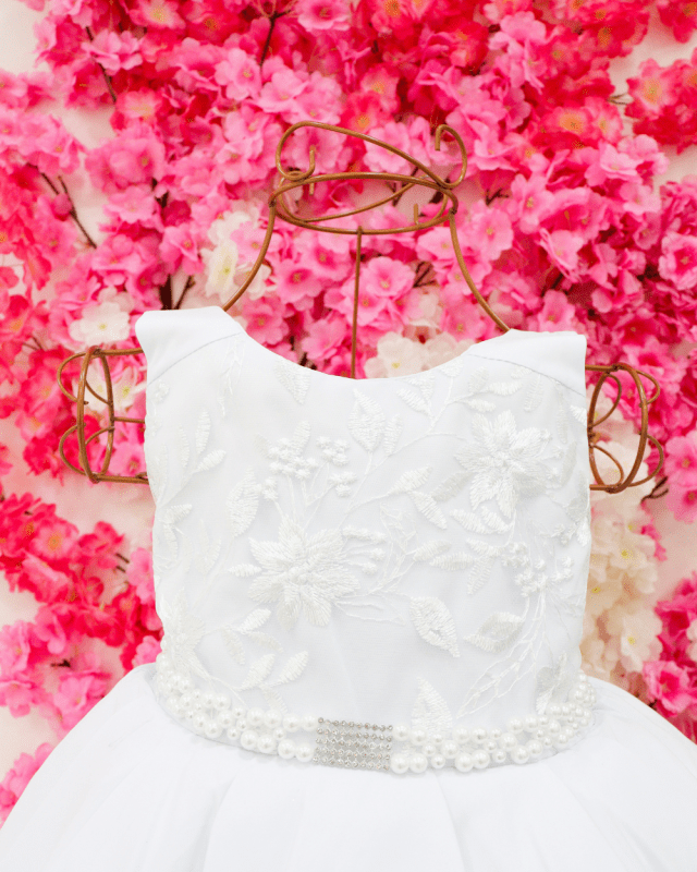 Vestido Bella Child regata branco, com peito rendado super delicado saia com tule , cinto de pérolas e costa elástica para melhor ajuste ao corpo.