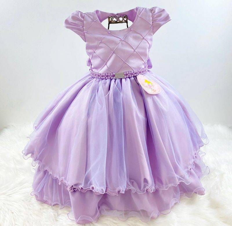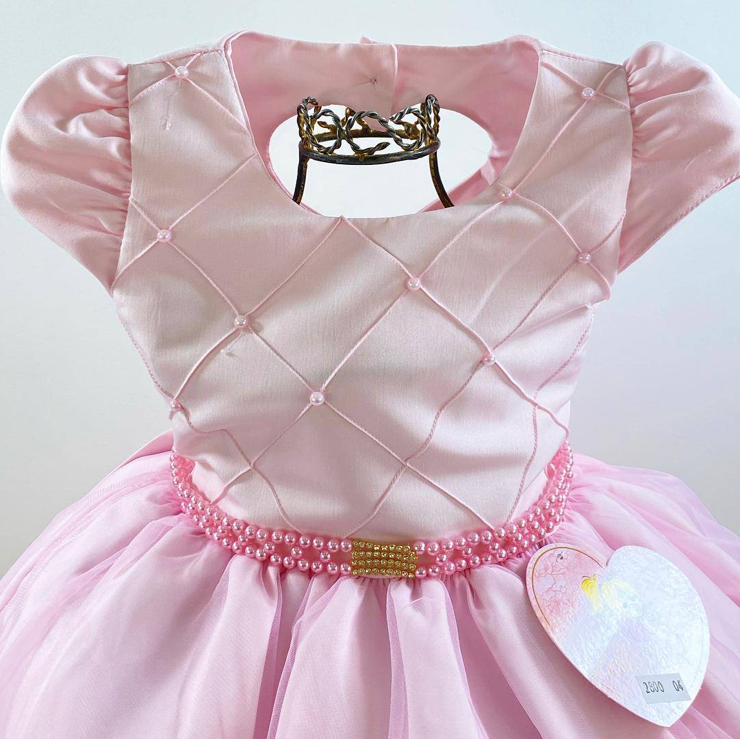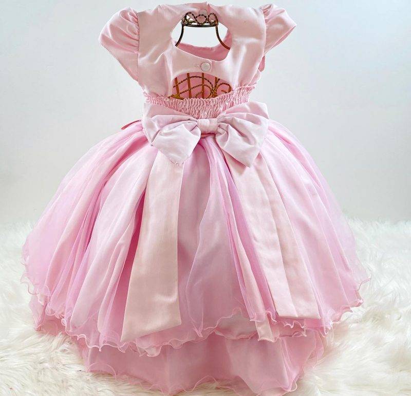Vestido infantil manga curta, peito nervura com bordado, saia lisa voal. Cintura bordada com pérolas sintéticas. Elástico nas costas ajustável ao corpo e laço.