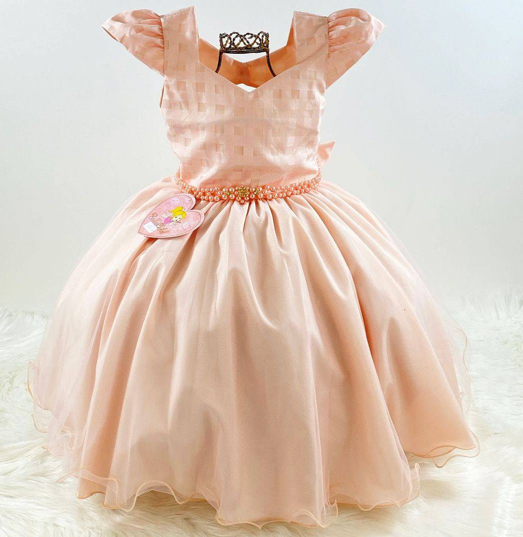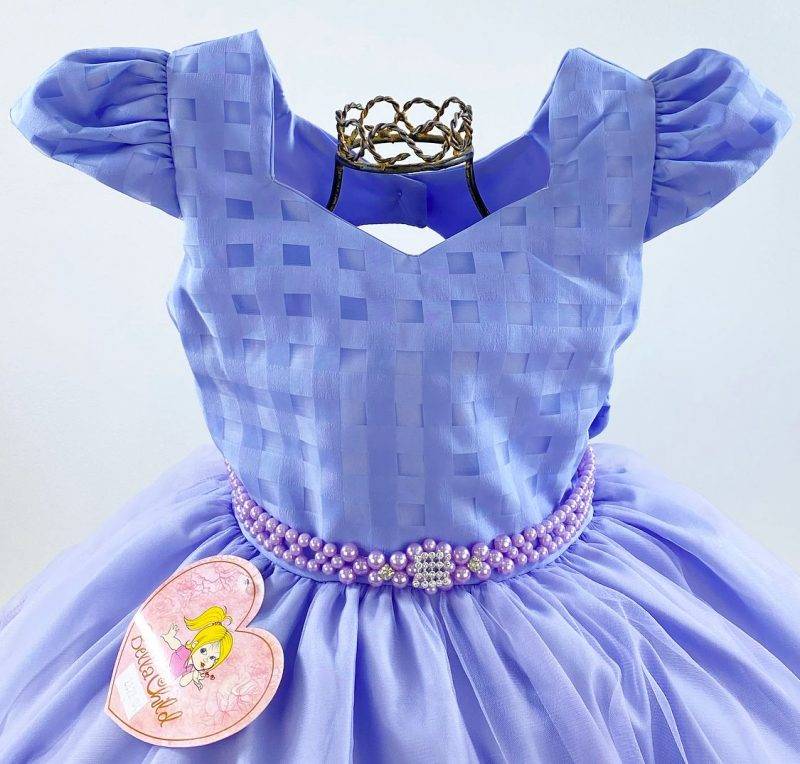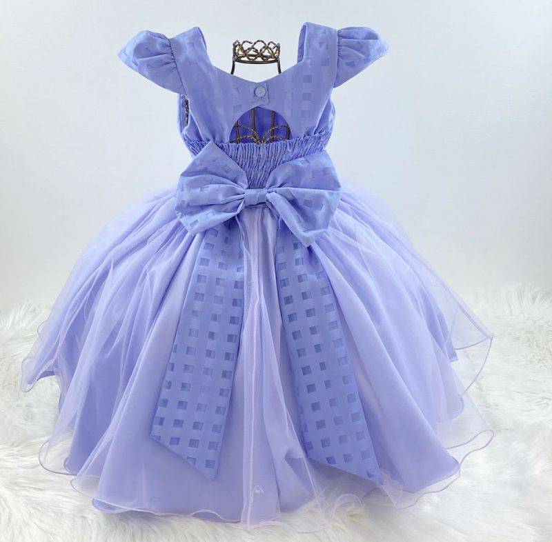 Vestido infantil manga curta, peito com quadriculado com transparência, saia lisa voal. Cintura bordada com pérolas sintéticas. Elástico nas costas ajustável ao corpo e laço.