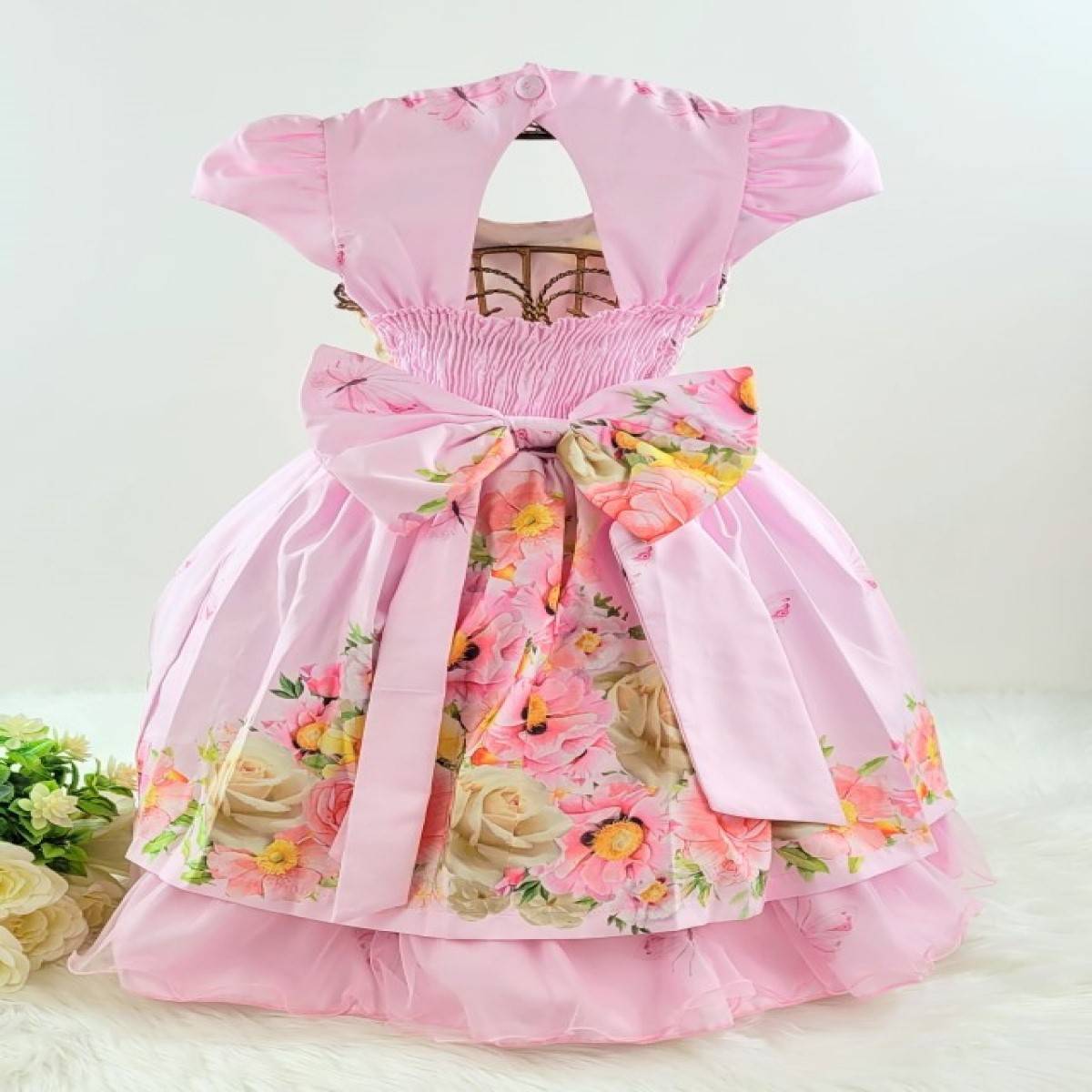 Vestido manga curta infantil,peito com nervura e laço, corpo estampa floral. Cintura com pérolas sintéticas, saia com babado de tule. Elástico nas costas ajustável ao corpo e laço.