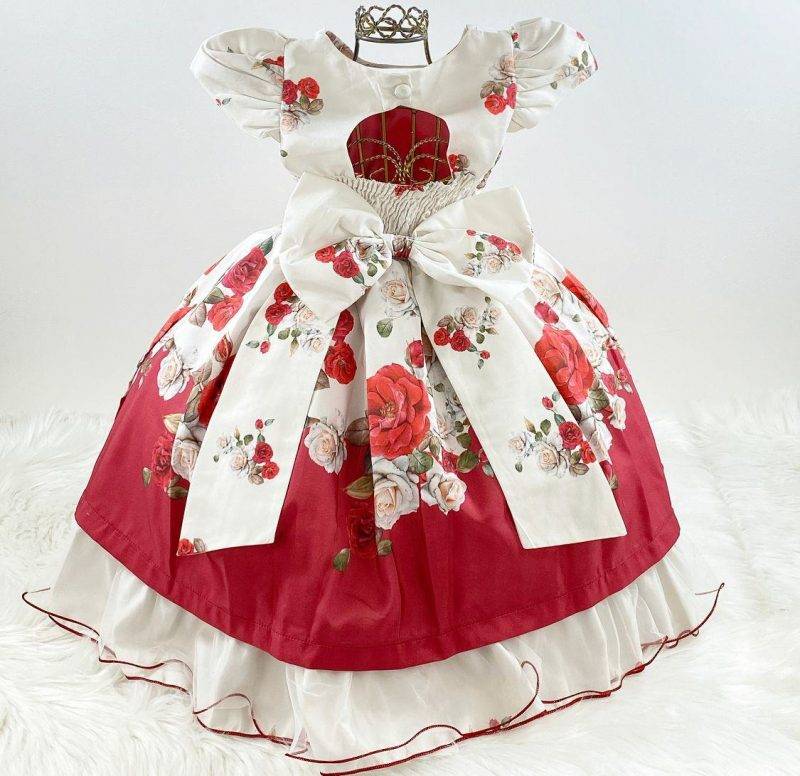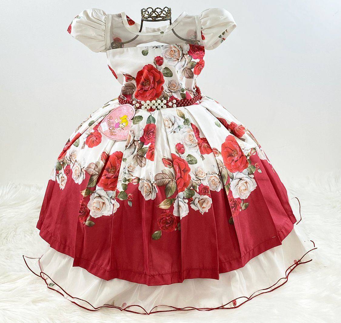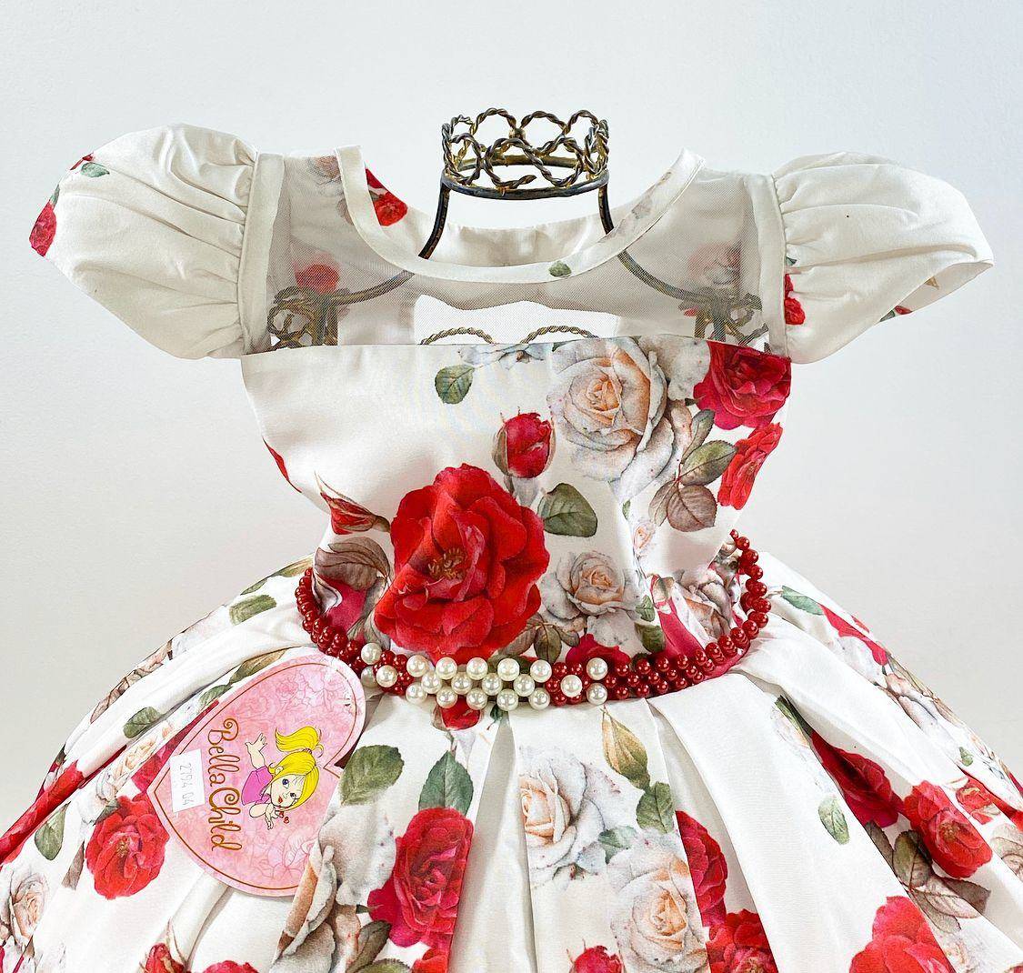 Vestido infantil manga curta , com forro, peito floral com de tule. Cintura com pérolas sintéticas e strass, saia lisa voal floral com tule listrado, contém elástico atrás para melhor ajuste ao corpo e laço.