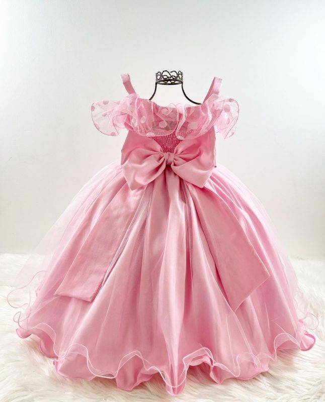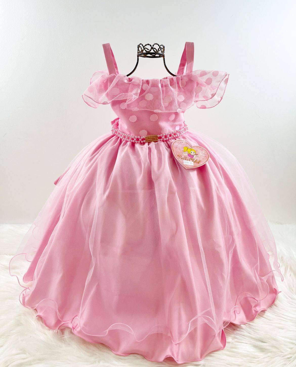 Vestido infantil de alça, peito com babado de tule, saia lisa, cintura com cintinho de pérolas sintéticas e strass. Elástico nas costas ajustável ao corpo e laço.