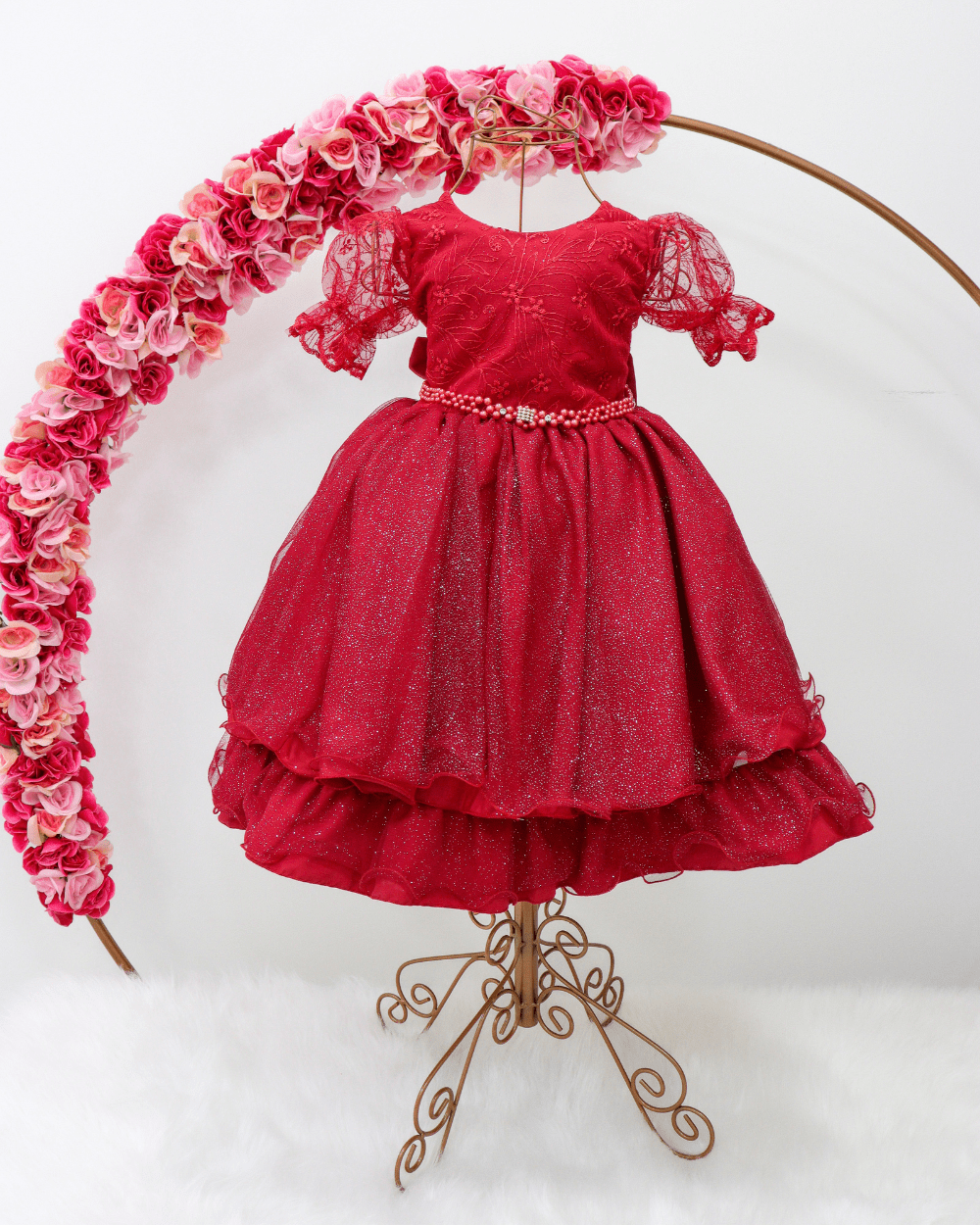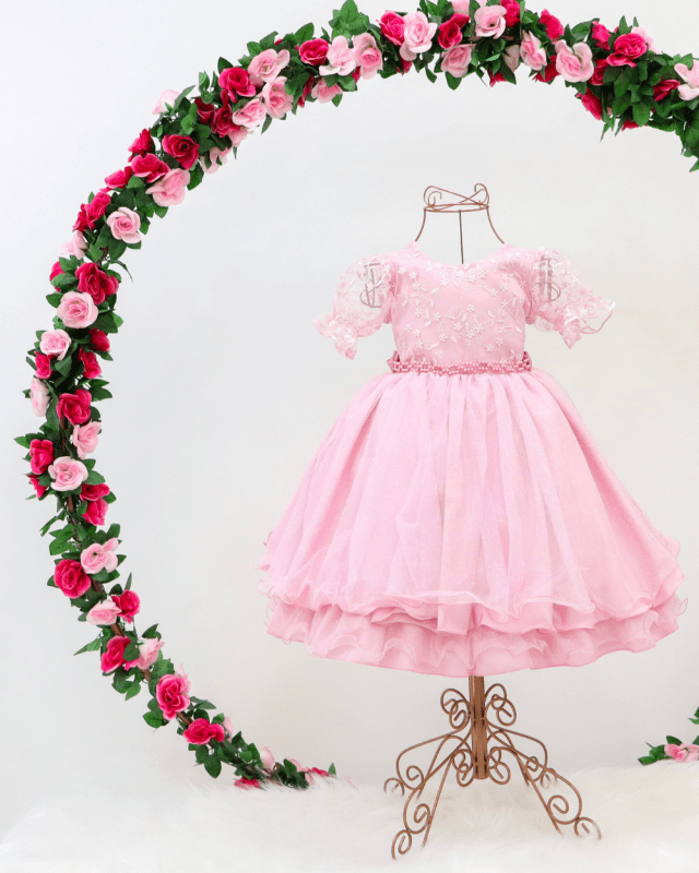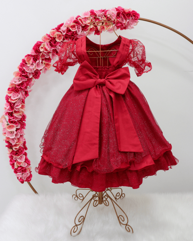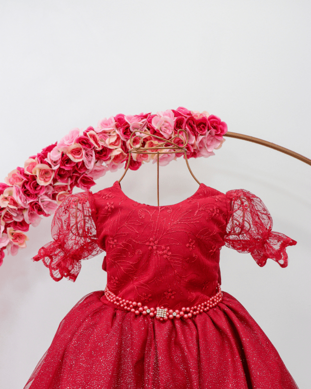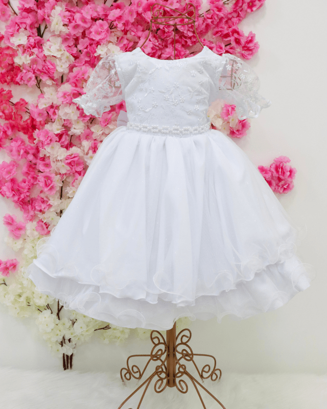 Vestido infantil manga curta com tule , peito rendado. Cintura com pérolas sintéticas, saia lisa com tule de brilho, contém elástico atrás para melhor ajuste ao corpo e laço.