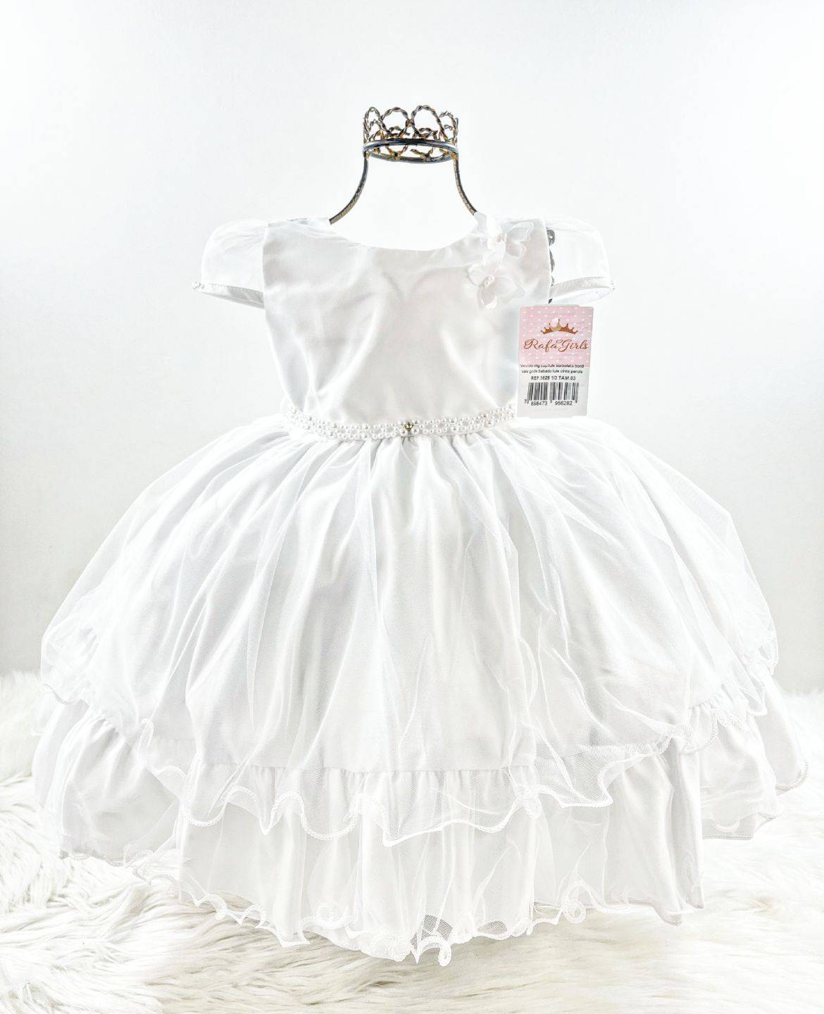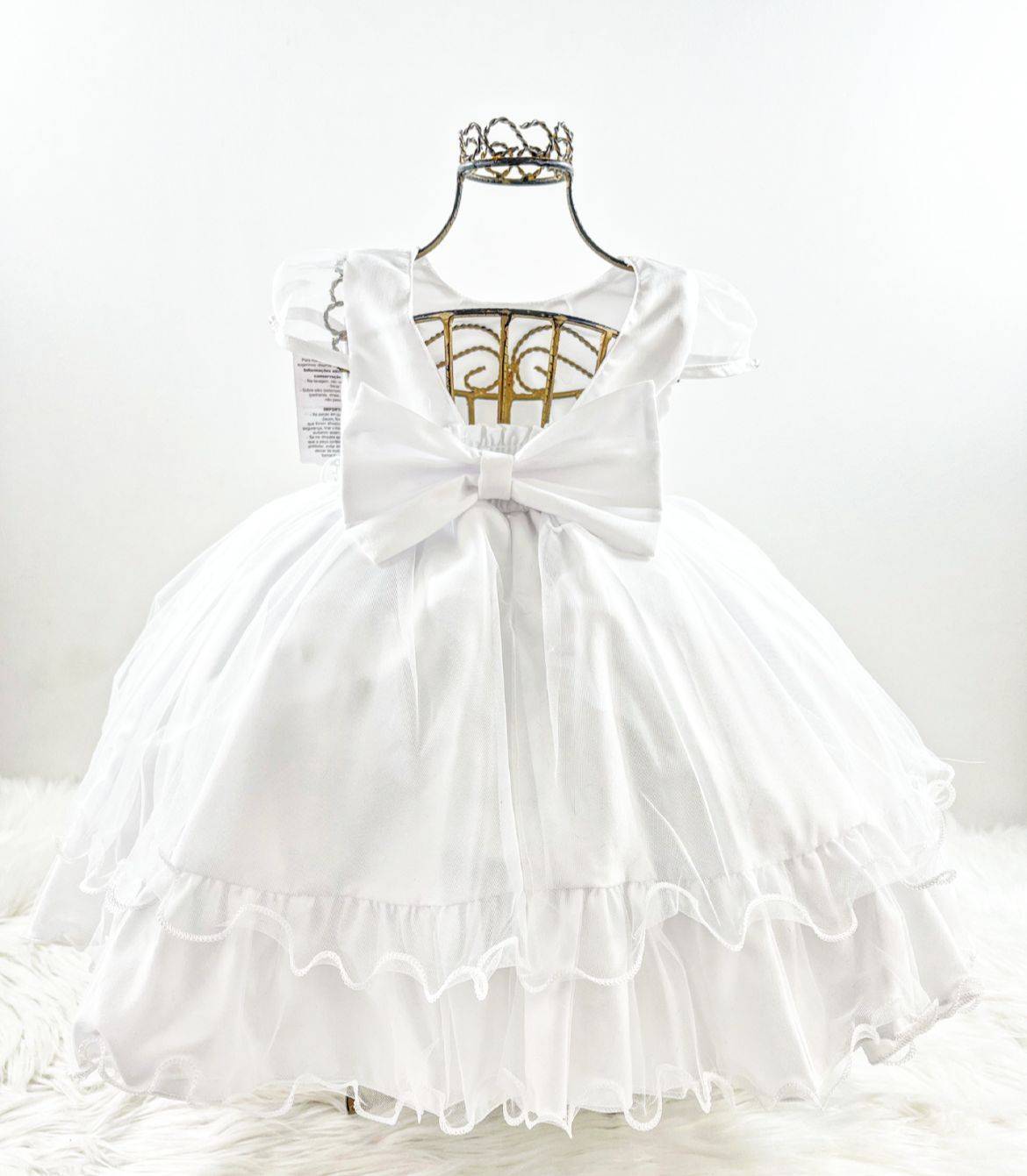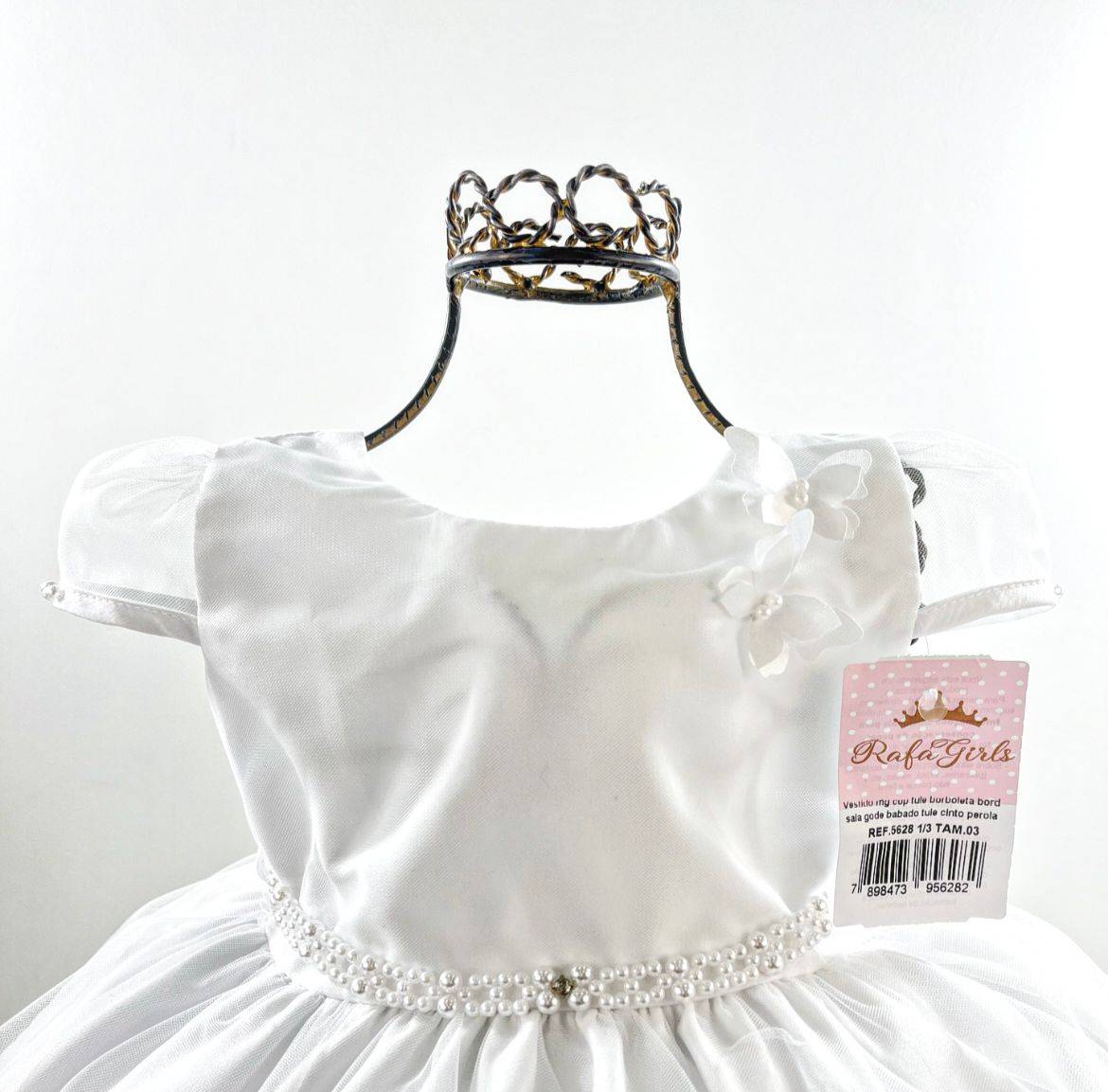 Vestido infantil manga curta, peito liso com aplique de borboletas e manga de tule com detalhes em pérolas sintéticas . Cintura bordada com pérolas sintéticas, saia lisa com uma camada de tule, elástico nas costas ajustável ao corpo.