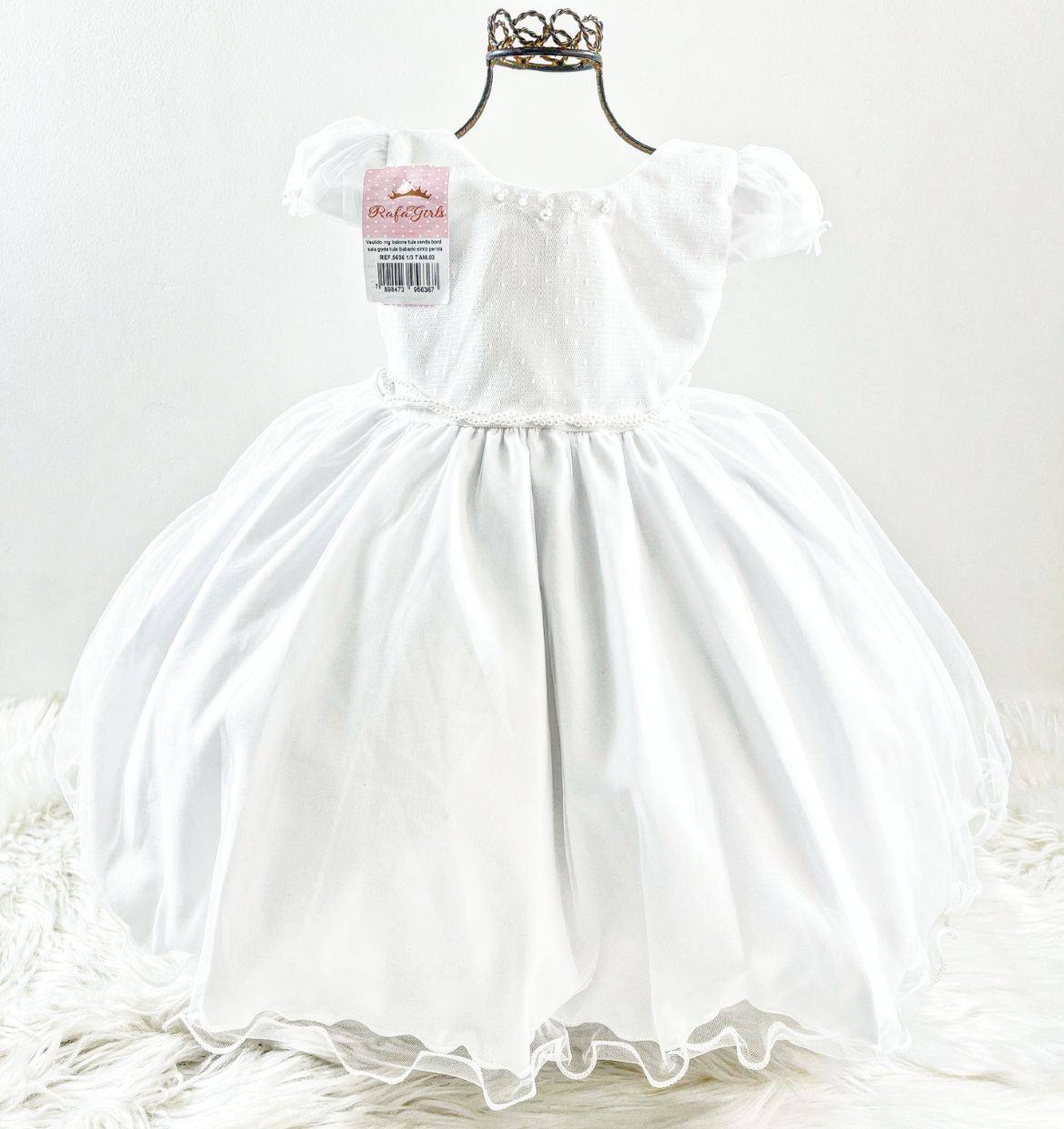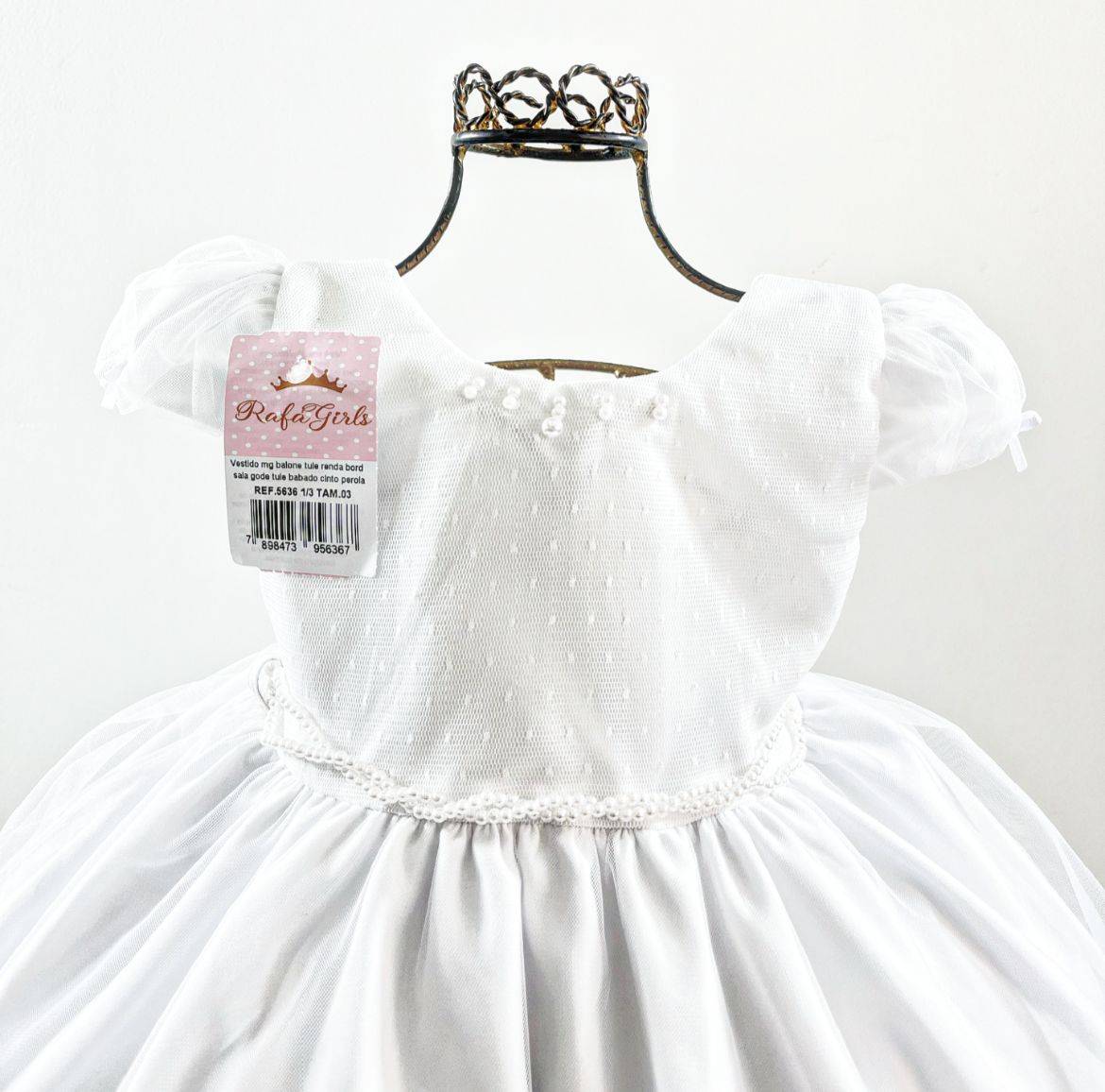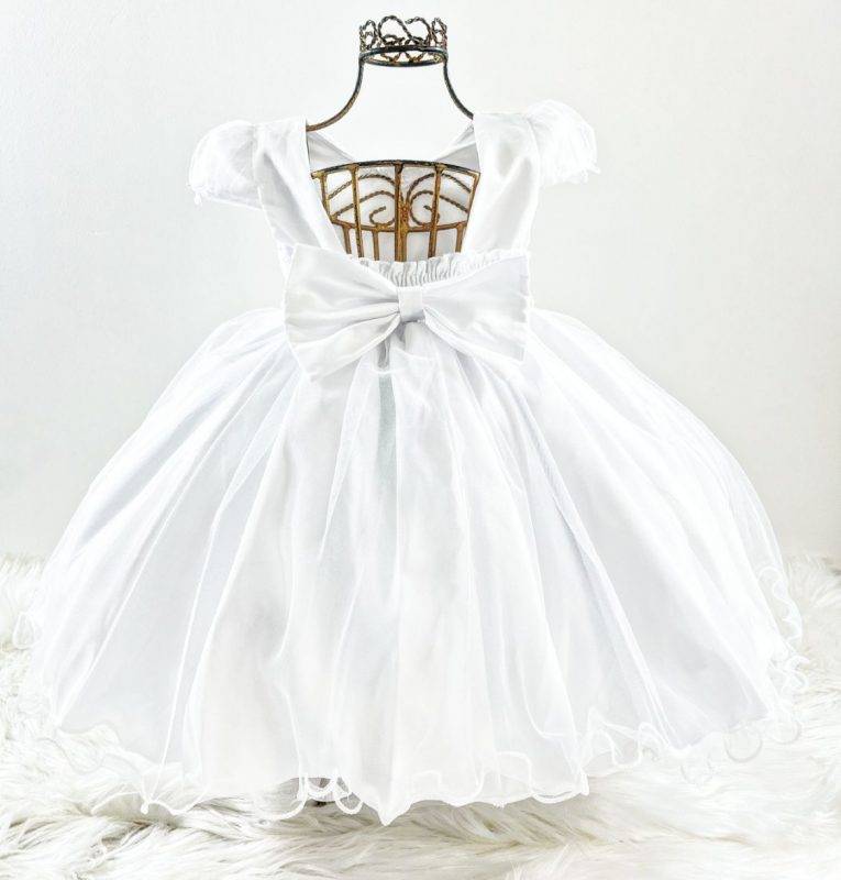 Vestido infantil manga curta, peito com renda e manga com detalhes de laço . Cintura bordada com pérolas sintéticas, saia lisa com uma camada de tule, elástico nas costas ajustável ao corpo.