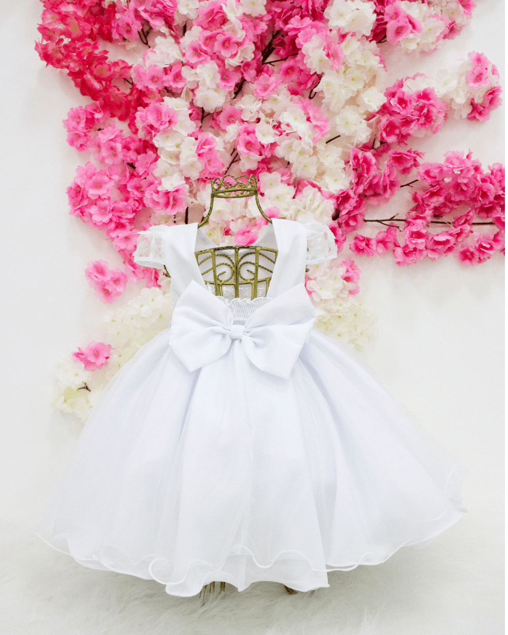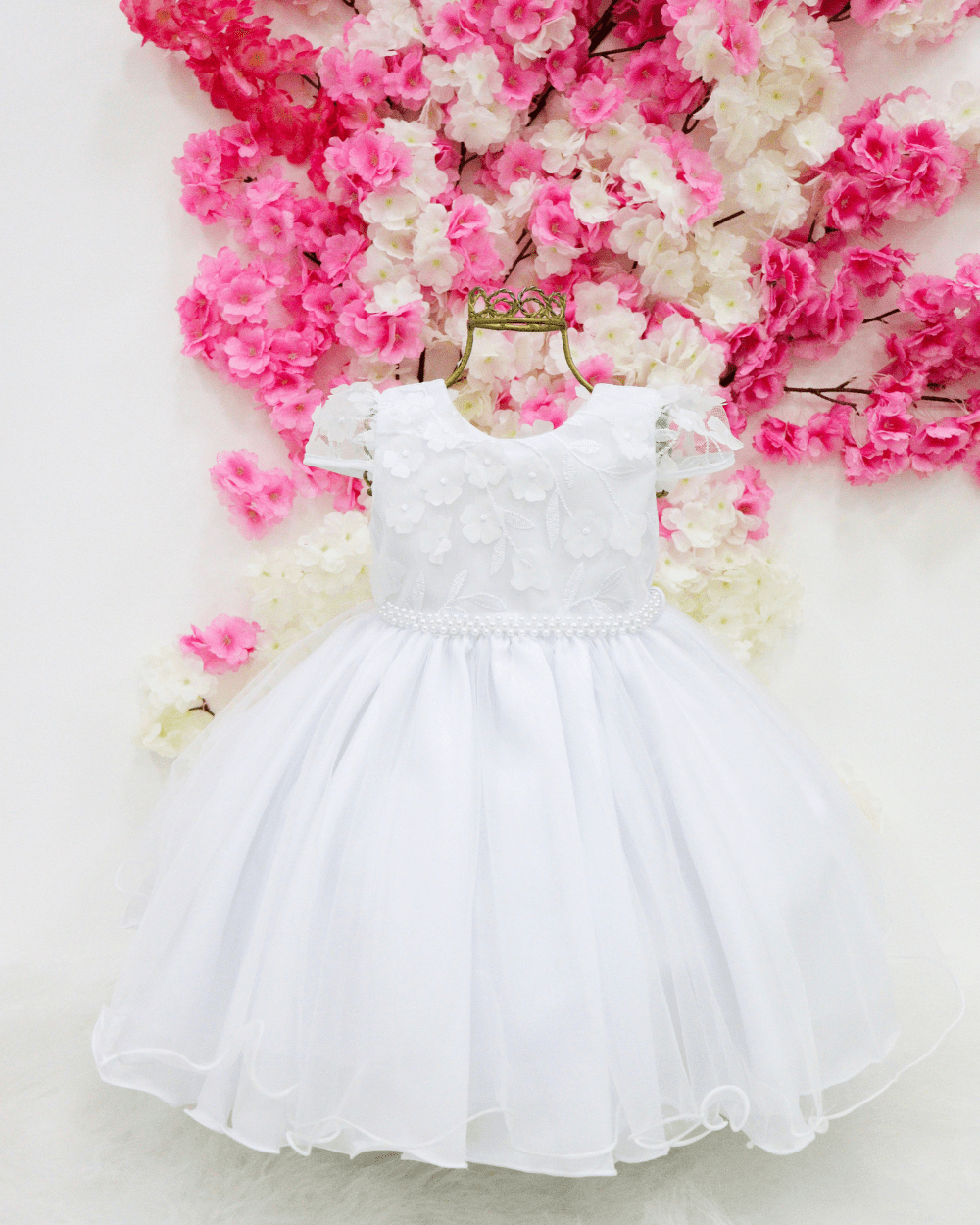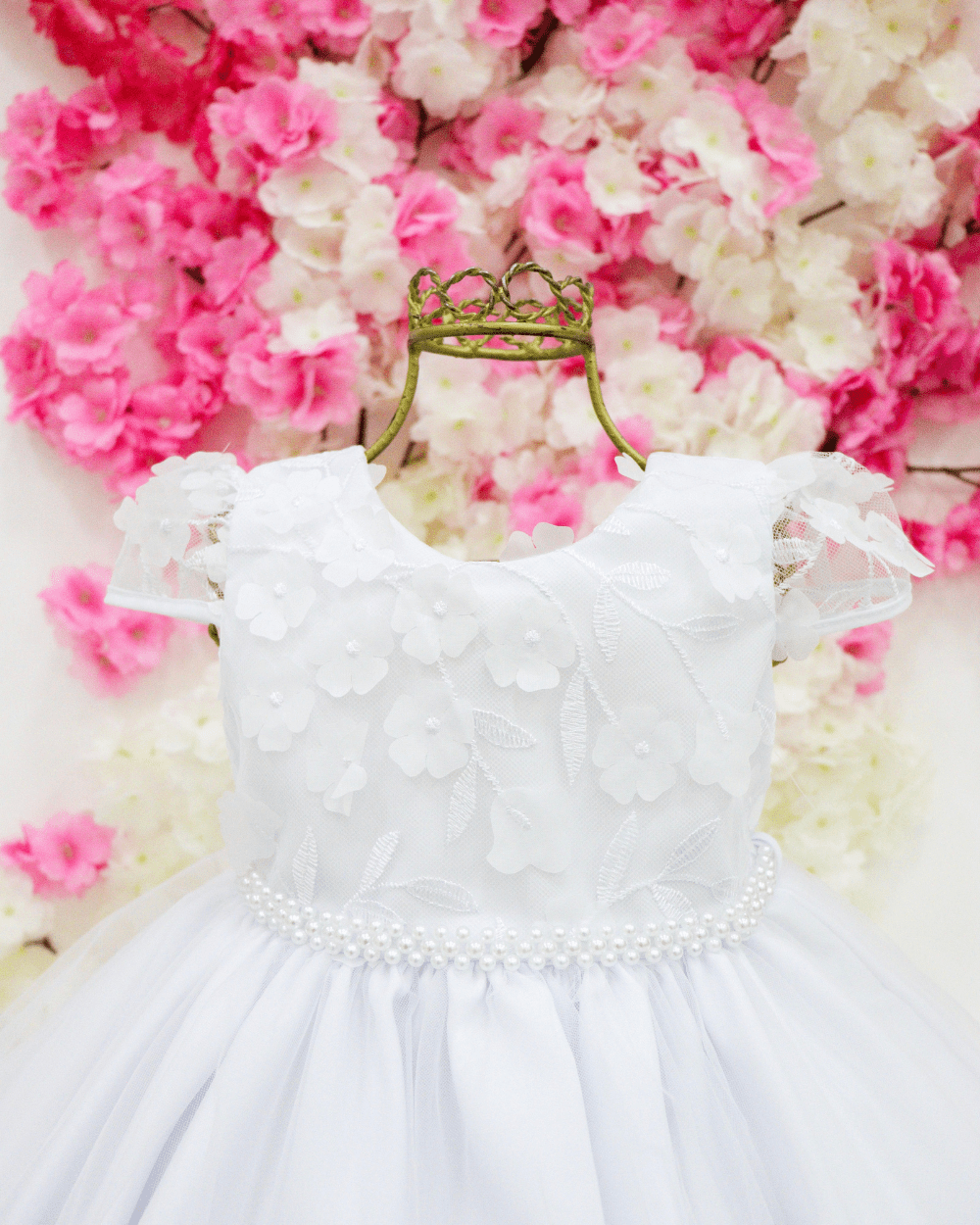 Vestido caracoles, manga curta, super delicado saia em tule, cinto de pérolas e costa elástica para melhor ajuste ao corpo.